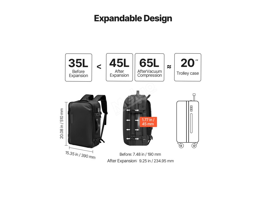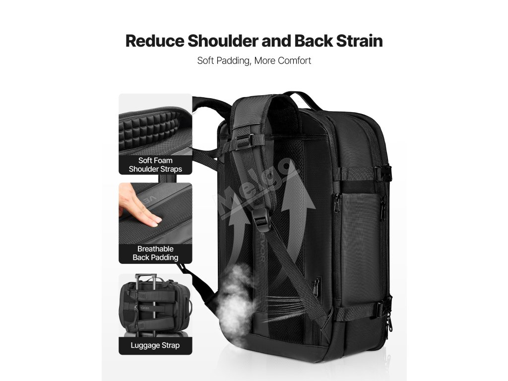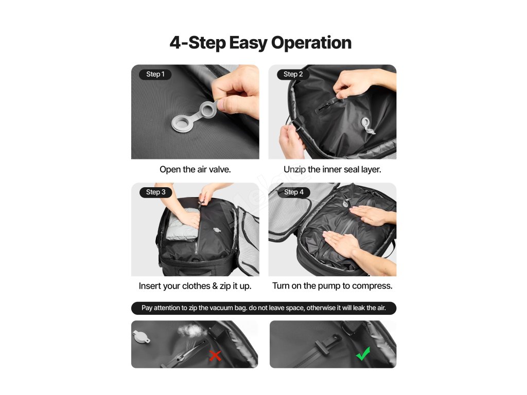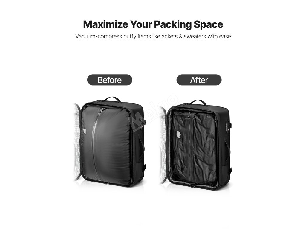 Tento vakuově uzavíratelný cestovní batoh umožňuje ručně vytlačit přebytečný vzduch. Je vybaven specializovanými přihrádkami a multifunkčními kapsami, jako je suchá a mokrá přihrádka, izolovaná kapsa, kapsa proti krádeži, a pojme vaše oblečení a věci denní potřeby. Součástí balení je zámek schválený úřadem TSA.