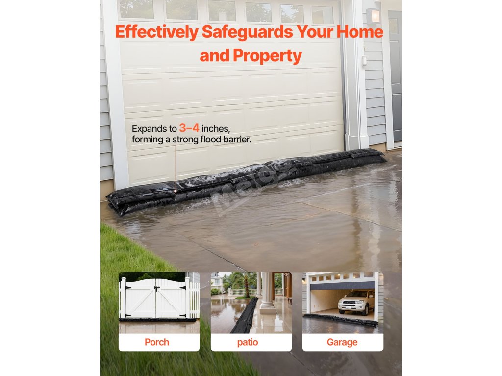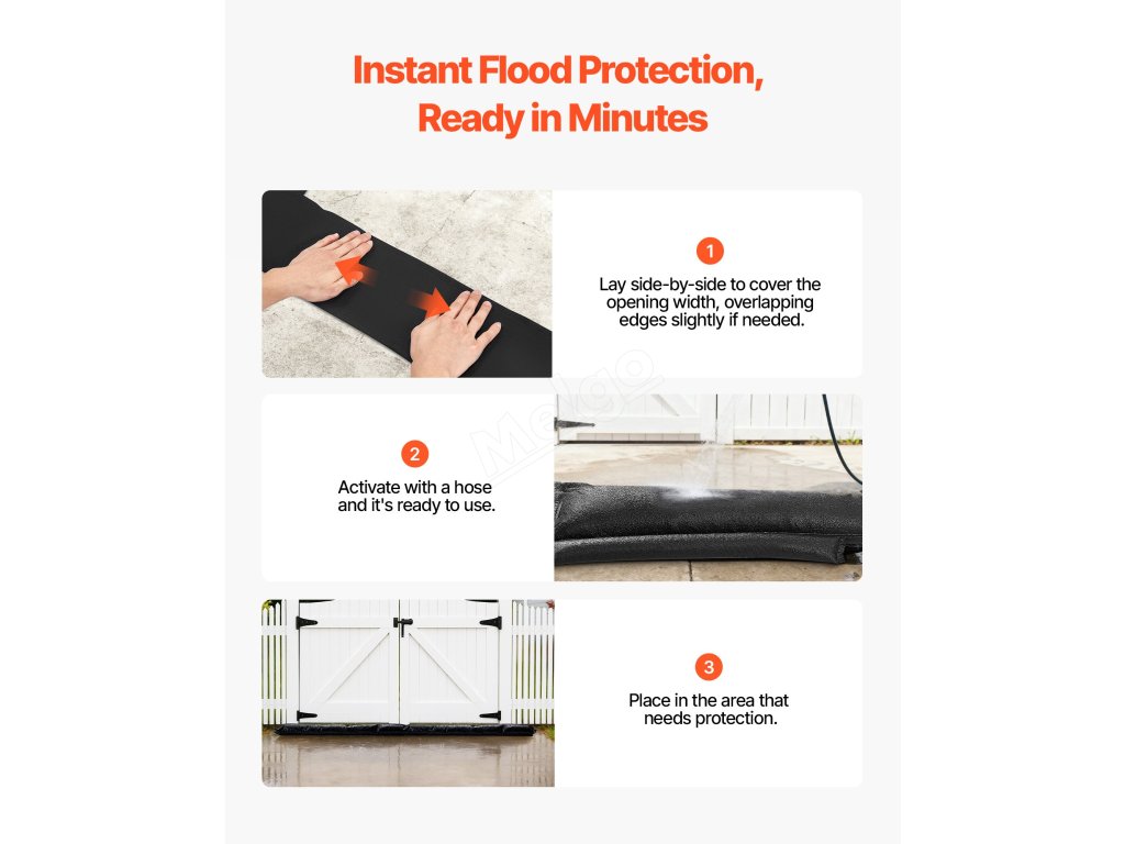 Odpověď: 1. Umístěte suchou zábranu na vnitřní stranu (suchou stranu) garážových vrat/vjezdu, aby tlak vody vytvořil těsnění. 2. Vložte suchou zábranu na vnitřní stranu (suchou stranu) garážových vrat/vjezdu. Umístěte několik tyčí vedle sebe tak, aby zakryly šířku otvoru, a v případě potřeby okraje mírně překryjte. 3. Vložte do otvoru několik tyčí. Aktivujte hadicí/dešťovou vodou - během 3 až 5 minut se rozšíří na 3 až 4 cm.