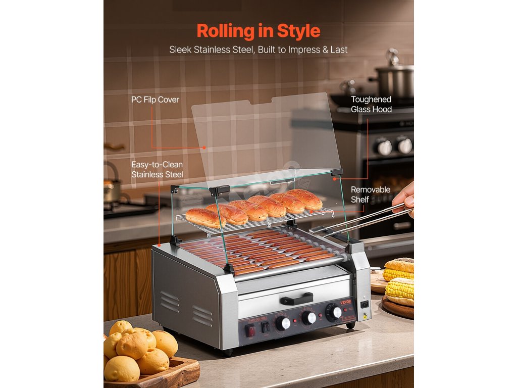 Tento komerční váleček na párky v rohlíku je odolný, elegantní a snadno se čistí a dodá vaší kuchyni estetický i funkční vzhled.