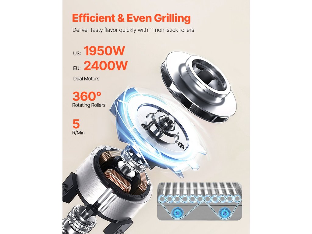 Výkonný motor a bezpečná regulace teploty umožňují otáčení všech válců z nepřilnavé nerezové oceli o 360 stupňů pro rovnoměrný ohřev.