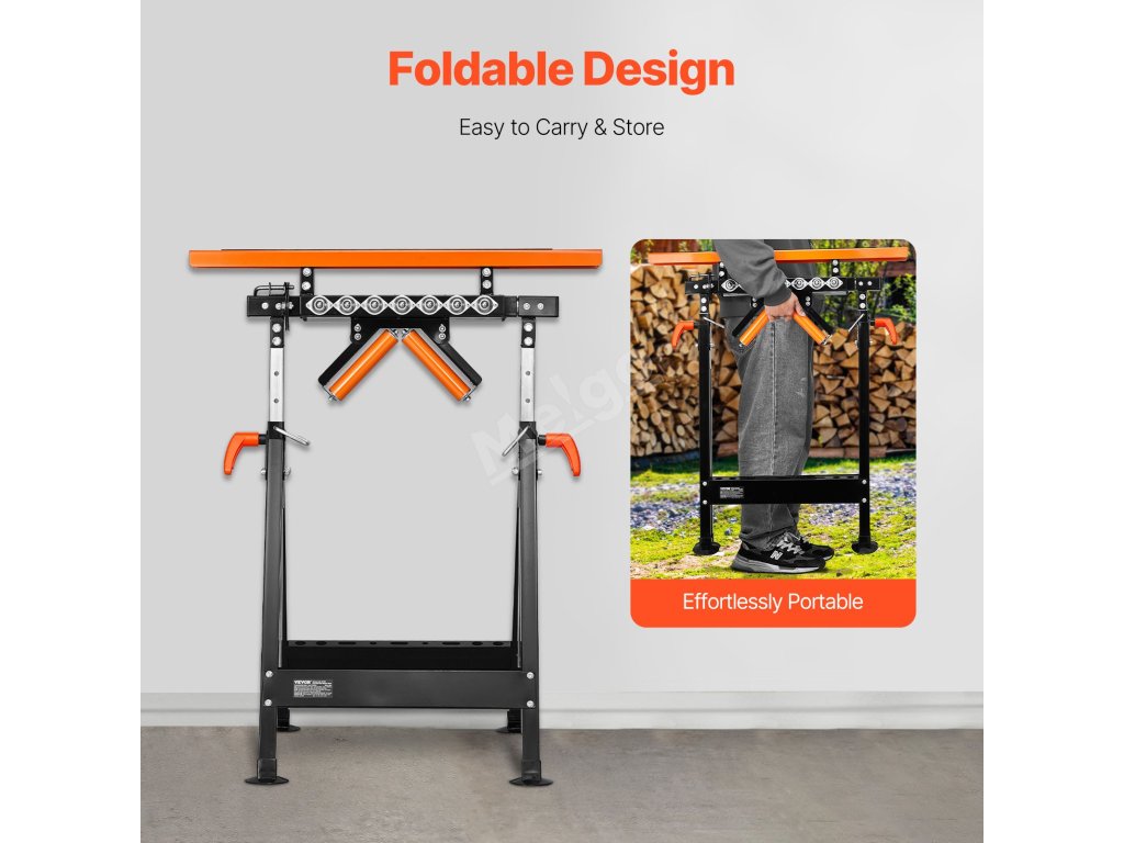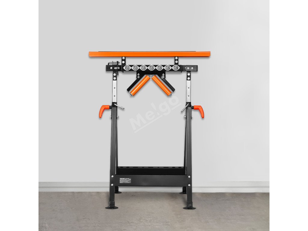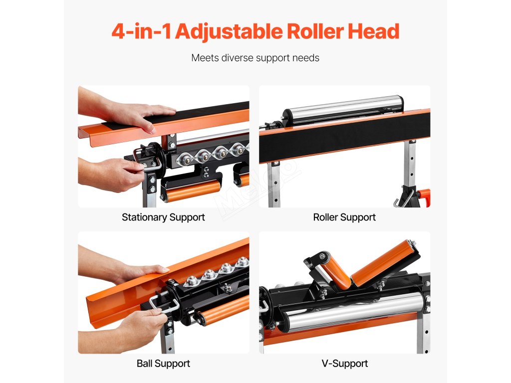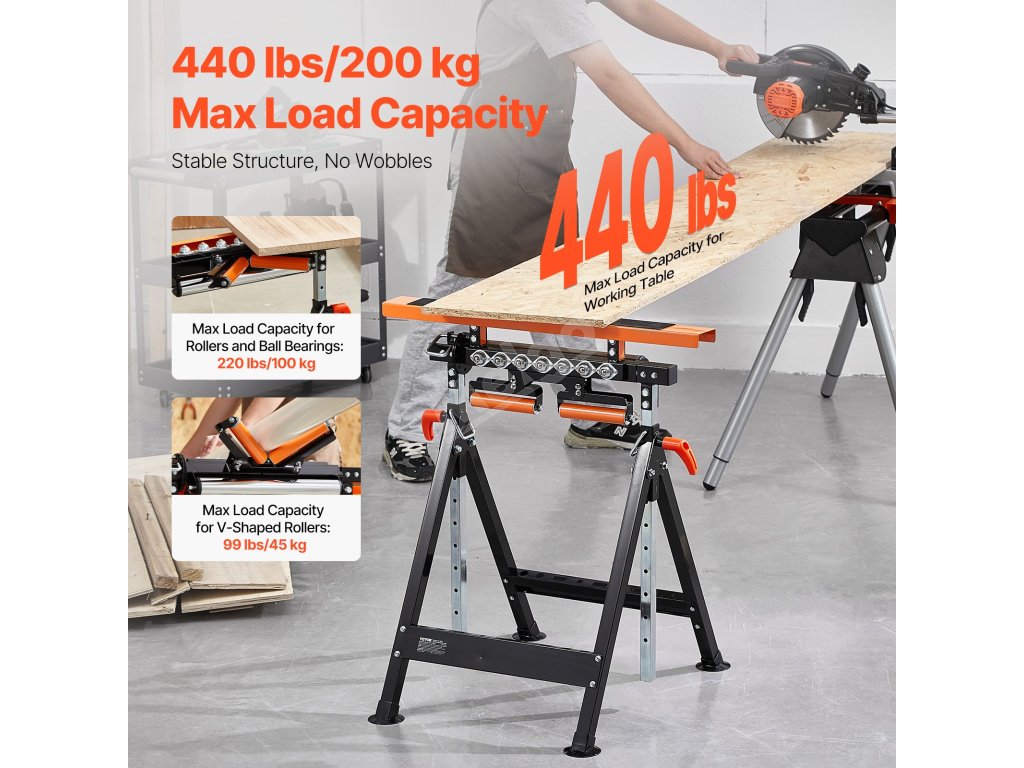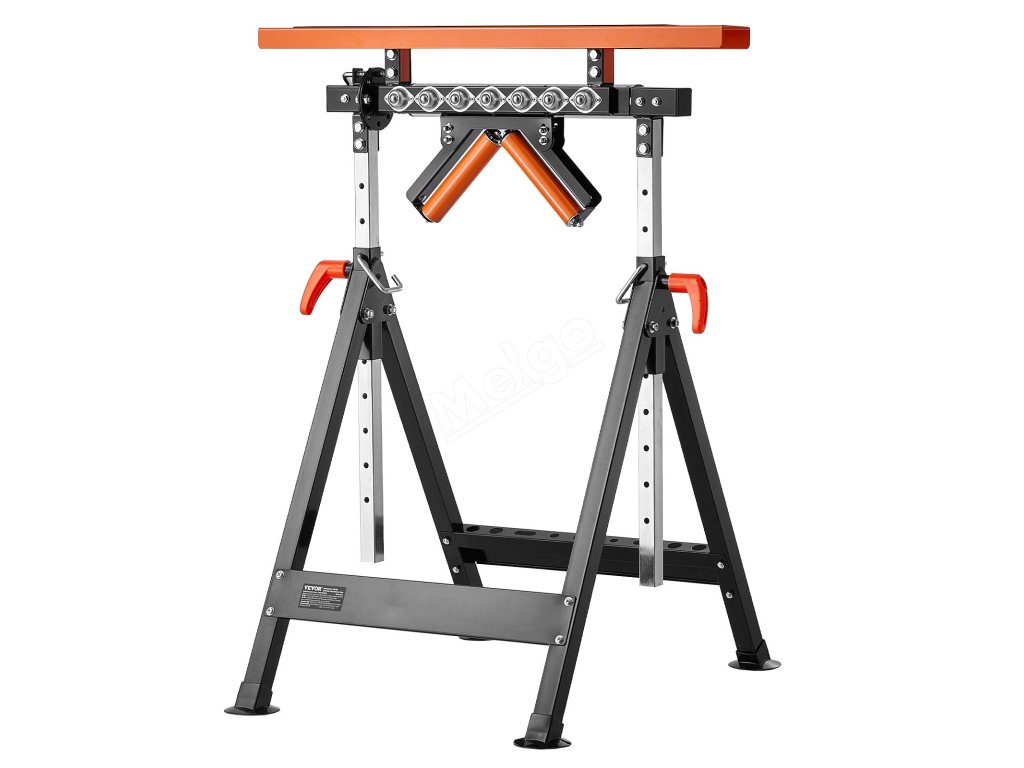 Stojan na kolečkách nabízí pevnou oporu s trojúhelníkovou konstrukcí, maximální nosnost 440 lb, nastavitelná výška 33-50 palců. Díky vlastnostem válečkového stojanu, stojanu na pilu, V-stojanu, vícesměrným válečkům a úložnému stojanu umožňuje flexibilní pohyb, těsné rolování, vysunutí pily a uložení nářadí.