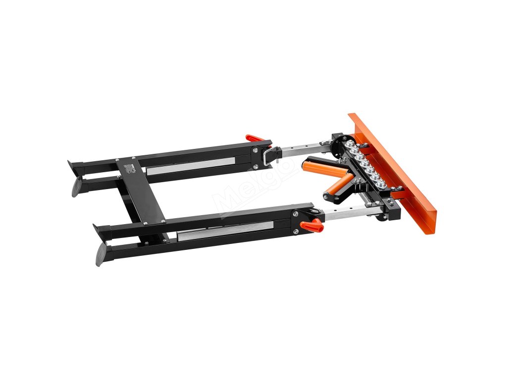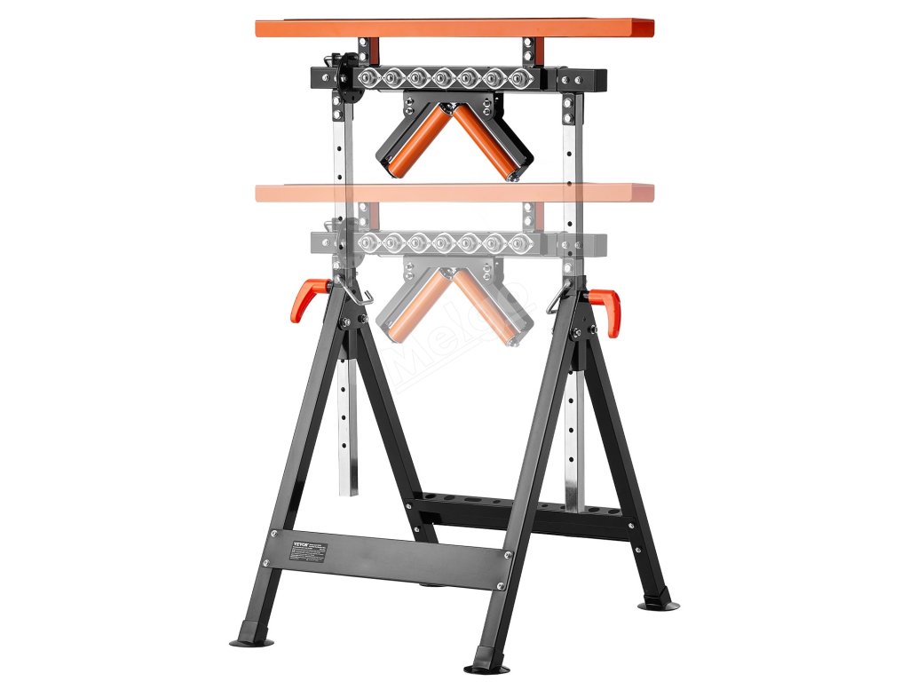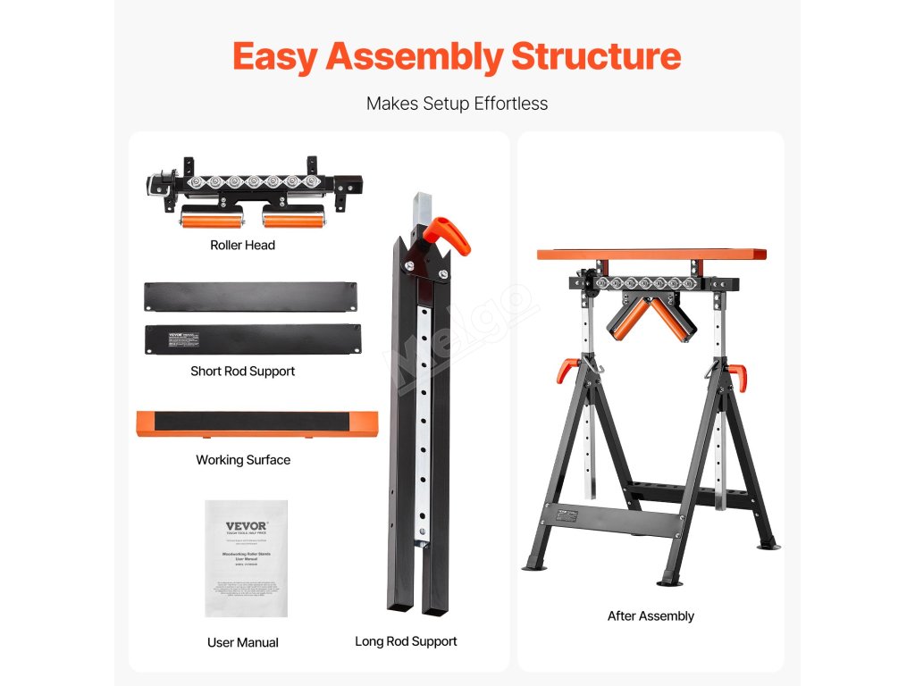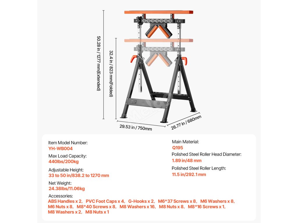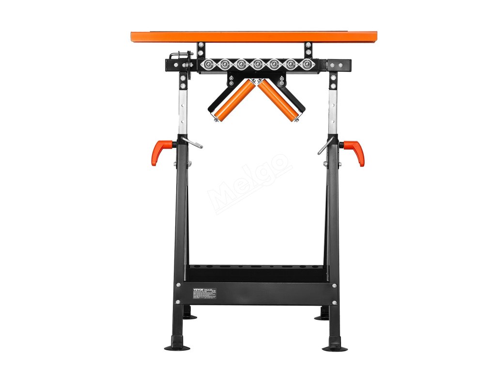 Stojan na kolečkách nabízí pevnou oporu s trojúhelníkovou konstrukcí, maximální nosnost 440 lb, nastavitelná výška 33-50 palců. Díky vlastnostem válečkového stojanu, stojanu na pilu, V-stojanu, vícesměrným válečkům a úložnému stojanu umožňuje flexibilní pohyb, těsné rolování, vysunutí pily a uložení nářadí.