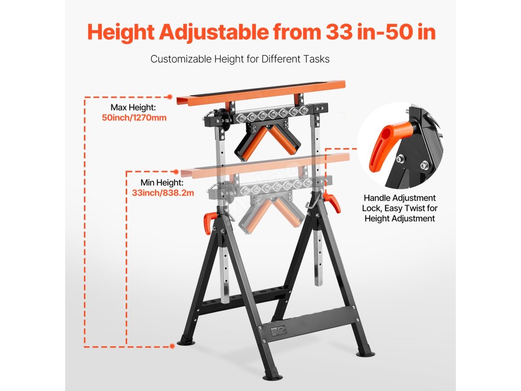 Válečkový stojan stolní pily je vybaven zámkem pro nastavení rukojeti z ABS, který umožňuje nastavit výšku stojanu v rozmezí 33-50 in pouhým otočením zámku, což zajišťuje flexibilitu při používání. Je uživatelsky přívětivý, takže jeho obsluhu zvládnou jak noví, tak zkušení uživatelé.