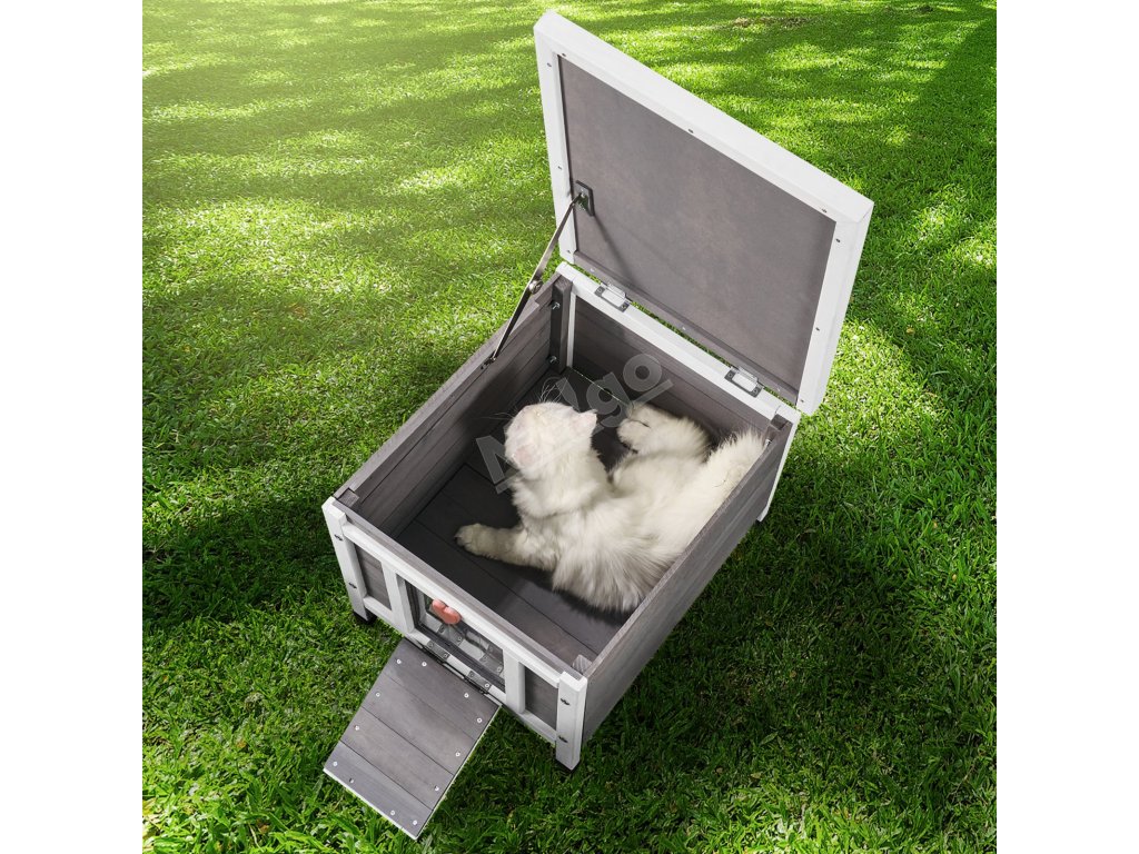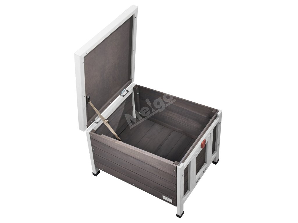 Šikmá střecha zabraňuje hromadění vody a poskytuje kočce pohodlný prostor k odpočinku. Silné závěsy dvířek z PVC poskytují ochranu před větrem a deštěm a zároveň umožňují snadný přístup.