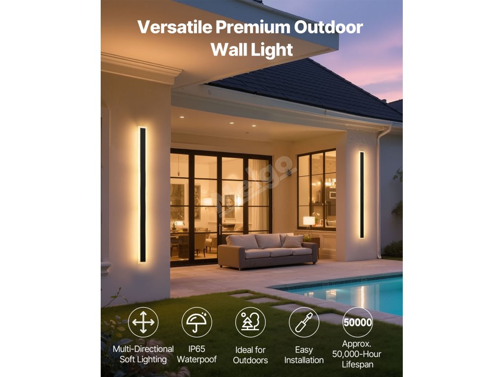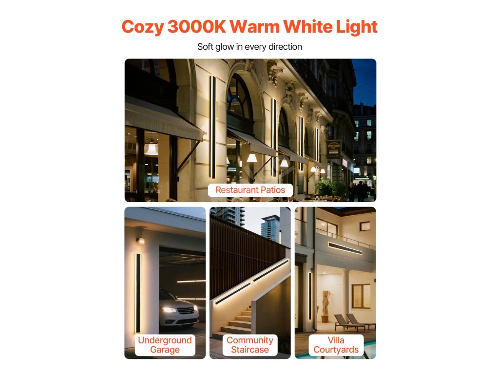 Toto venkovní nástěnné svítidlo, které poskytuje teplé bílé světlo o teplotě 3000 K směrem nahoru, dolů a do stran, snadno vytvoří jemnou atmosféru ve venkovních jídelnách a na dvorech vil. Poskytuje neoslňující osvětlení, zvýrazňuje orientační body nebo orientační cesty a zároveň zajišťuje praktickou viditelnost.