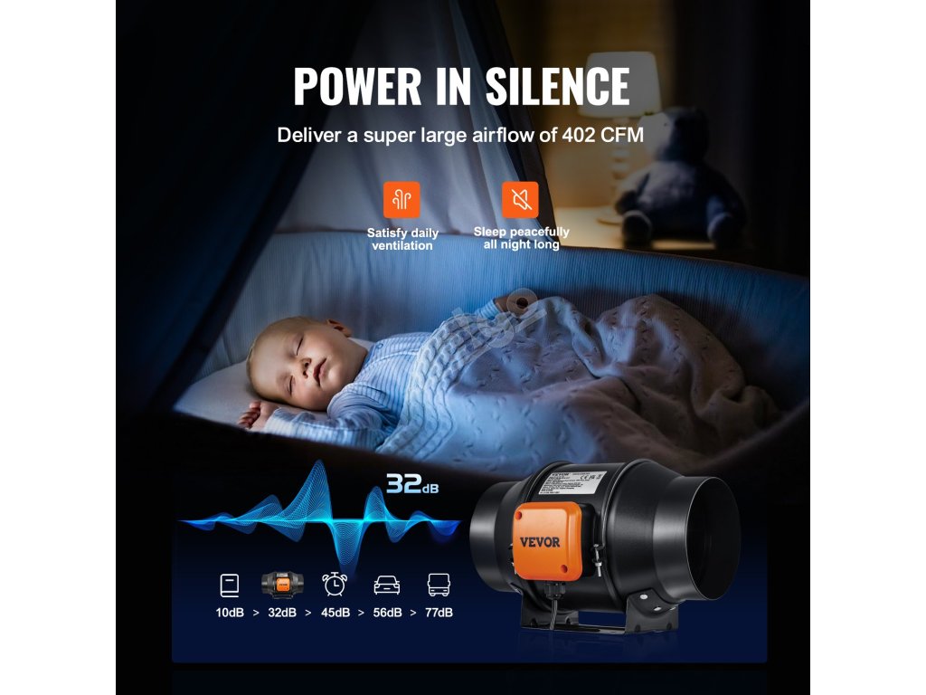 Díky pryžovým podložkám bez vibrací a vynikajícímu motoru může být hlučnost inline ventilátoru až 32 dB, což zabraňuje znečištění hlukem.
