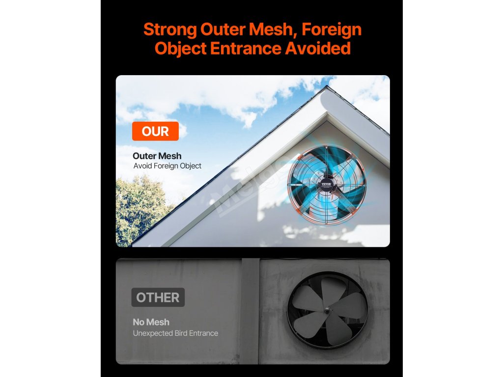 Tento štítový ventilátor vybavený vysokorýchlostným motorom poskytuje silný prúd vzduchu, ktorý rýchlo vyháňa horúci vzduch a znižuje teplotu v podkroví.