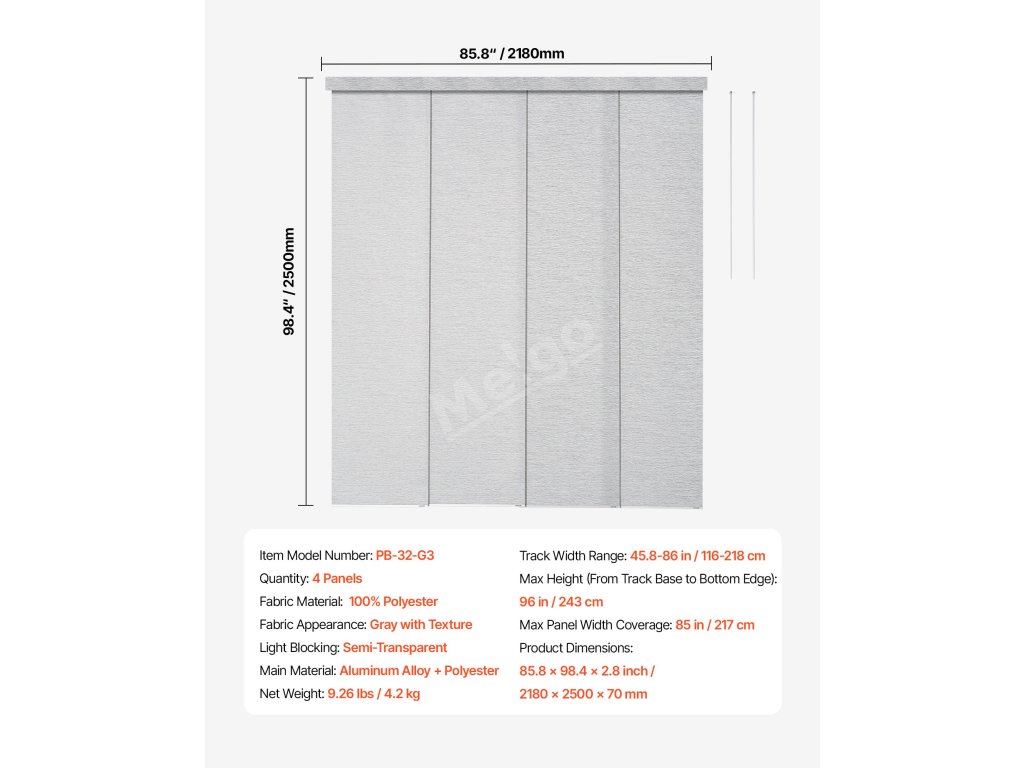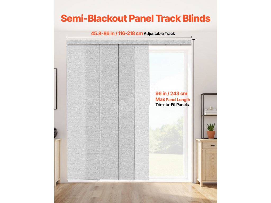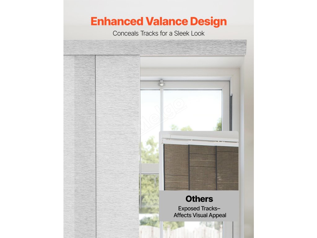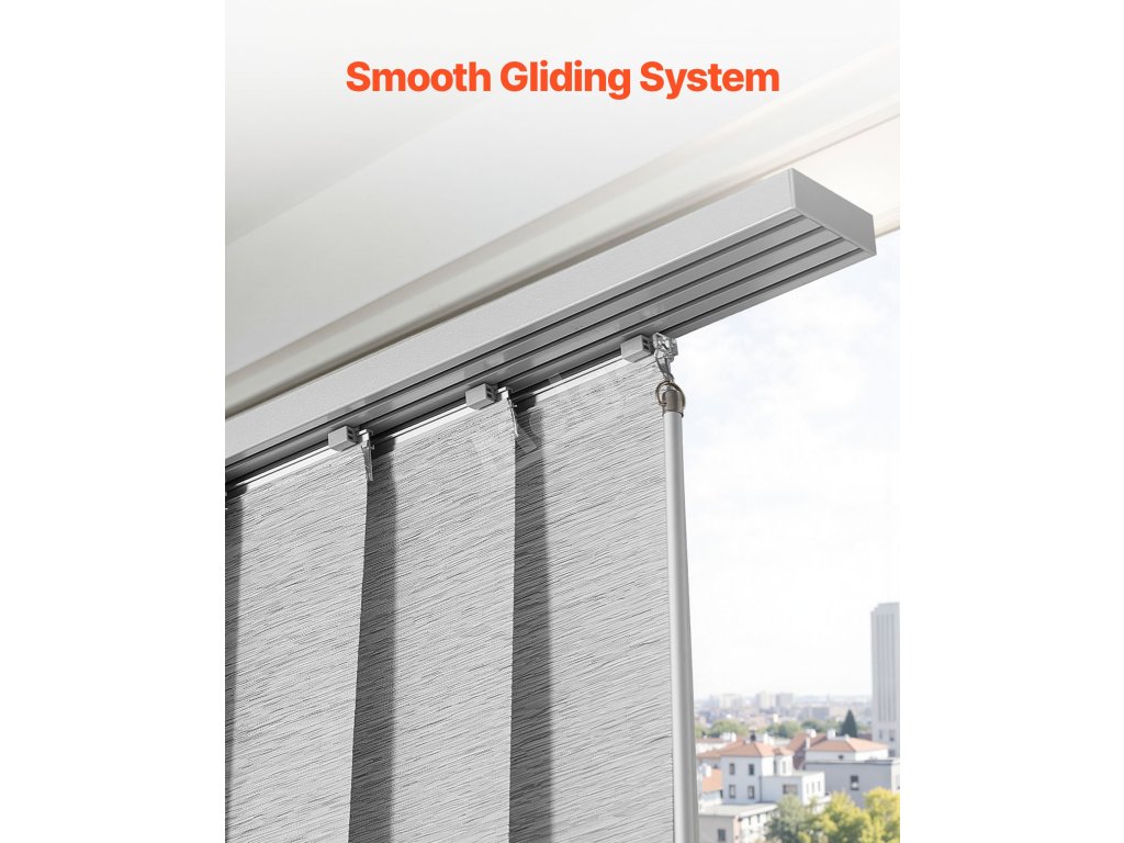 Tyto panelové žaluzie vyrobené z odolné polyesterové tkaniny jsou odolné proti roztržení a mají dlouhou životnost. Horní volán elegantně zakrývá kolejnici a vytváří elegantní vzhled. Snadno se posouvají vlevo nebo vpravo a jsou ideální pro terasové dveře, okna od podlahy ke stropu a další instalace, kde je potřeba styl a funkčnost.