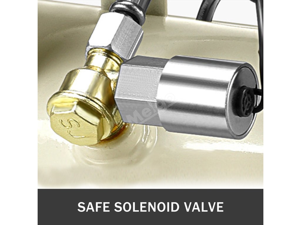 Náš kompresor je vybaven elektromagnetickým ventilem, 2 manometry, odlučovačem vody a bezpečnostním ventilem, který reguluje a udržuje tlak vzduchu v nádrži vždy v normálním rozsahu.