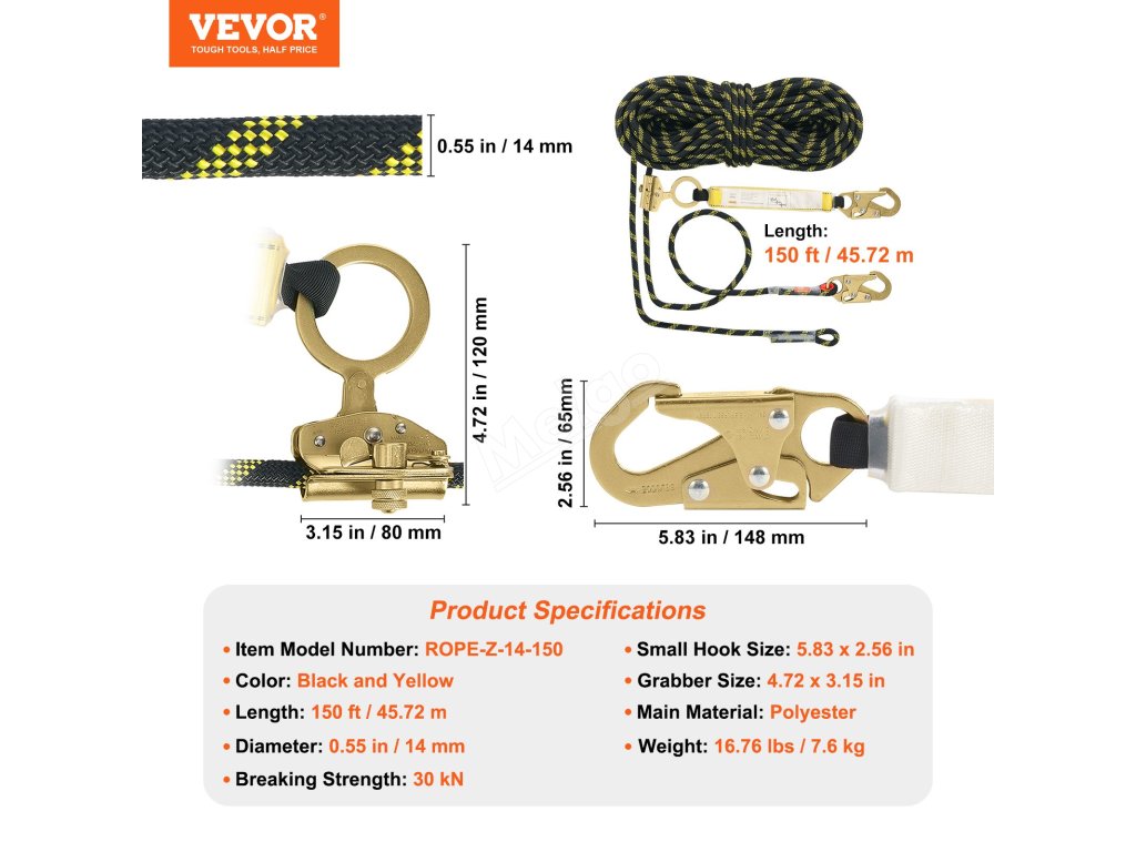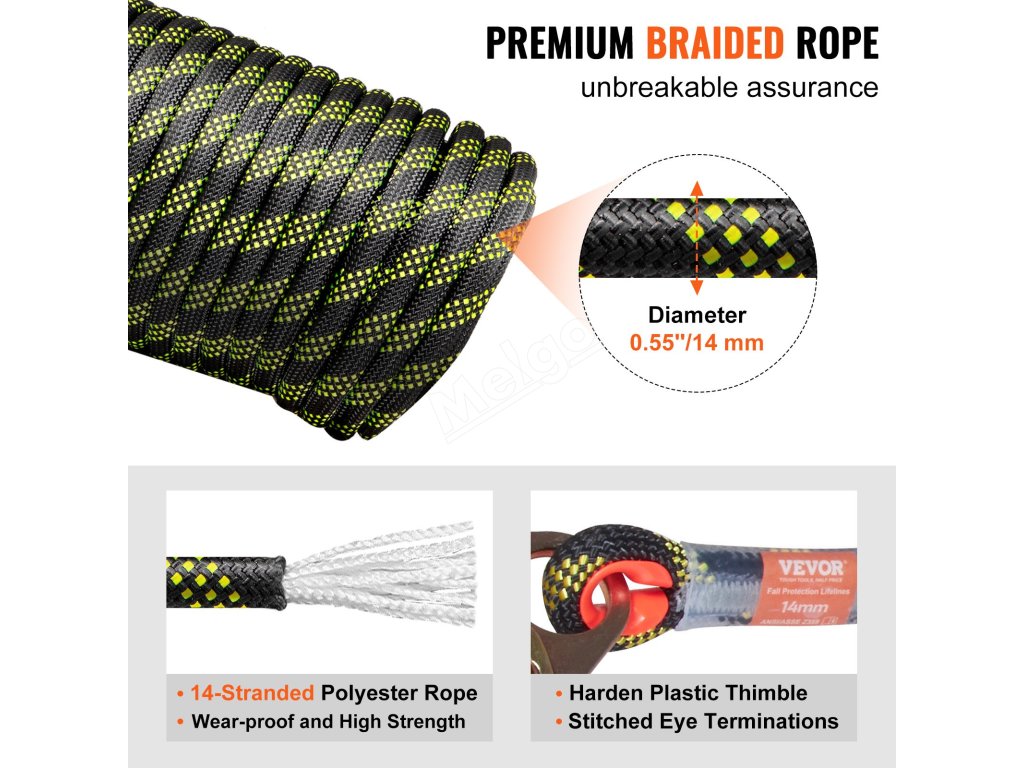 Naše 150ft ochranné lano proti pádu s průměrem 0,55'' a pevností v tahu 30 kn nabízí bezkonkurenční bezpečnost. Vyrobeno z vysoce pevného polyesterového materiálu s pletenou konstrukcí pro zvýšení pevnosti a odolnosti proti oděru.