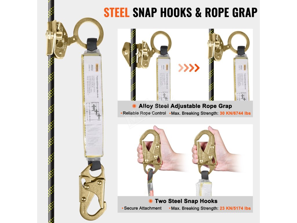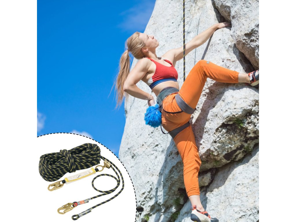 Dosáhněte maximální bezpečnosti s naším záchranným lanem se dvěma ocelovými karabinami (pevnost v tahu 23 KN/5174 lbs), které zajišťují pevné spojení s bezpečnostním zařízením. Nastavitelná rukojeť lana (pevnost v tahu 12 KN/2698 lbs) umožňuje snadný pohyb záchranného lana a zajišťuje jeho snadné použití.