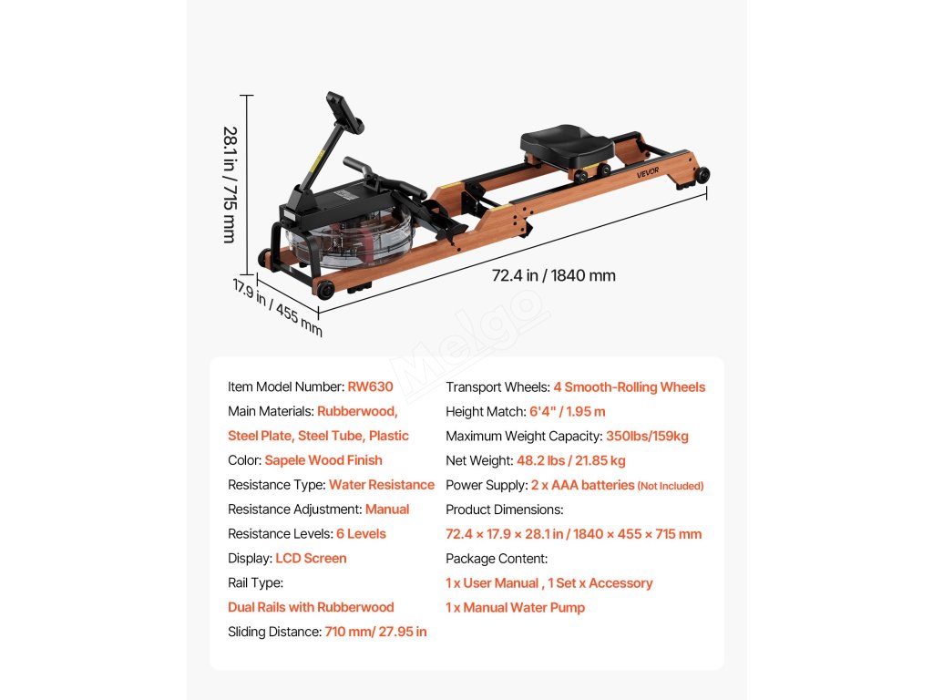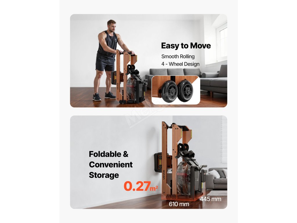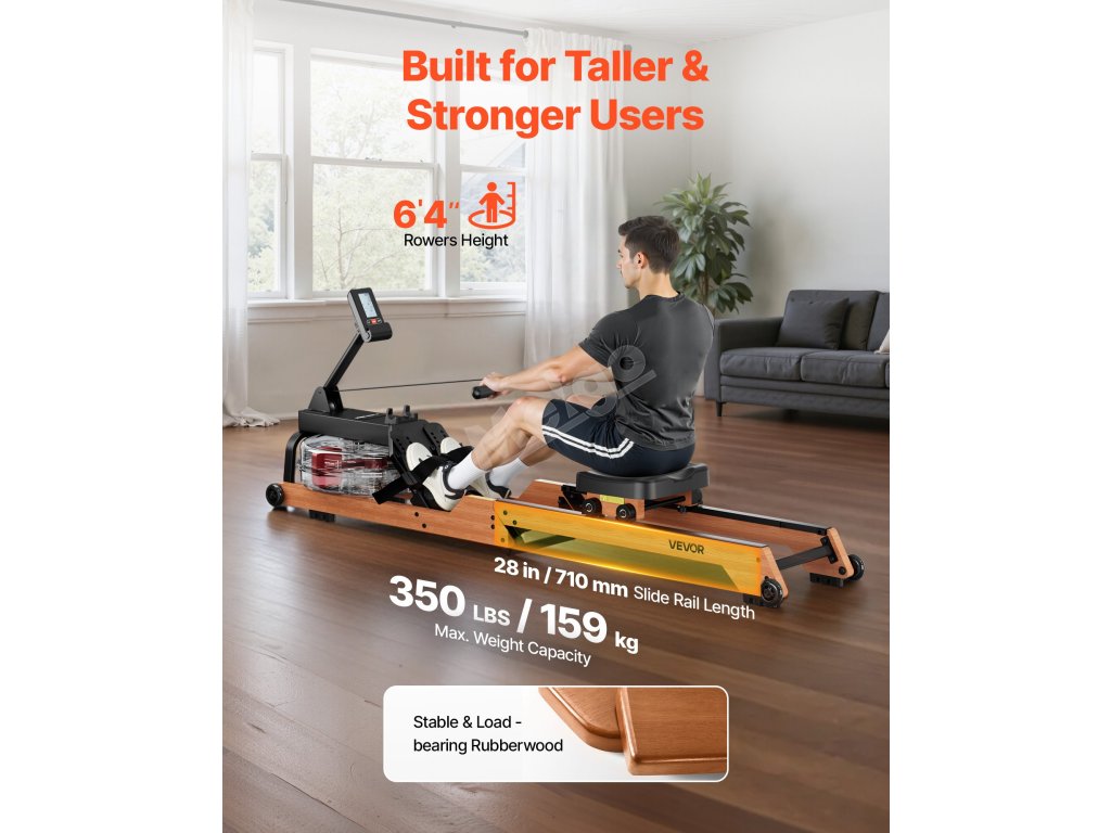 Veslovací trenažér unese až 350 kg díky silnému a odolnému rámu z pryžového dřeva, který zajišťuje pevnou stabilitu pro uživatele všech typů postavy. Dodá vaší domácnosti udržitelný, zdravý a stylový nádech. Hladká konstrukce se 4 kolečky umožňuje pohyb bez námahy a skládá se do svislé polohy pro úsporu místa při skladování.