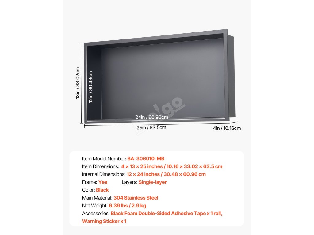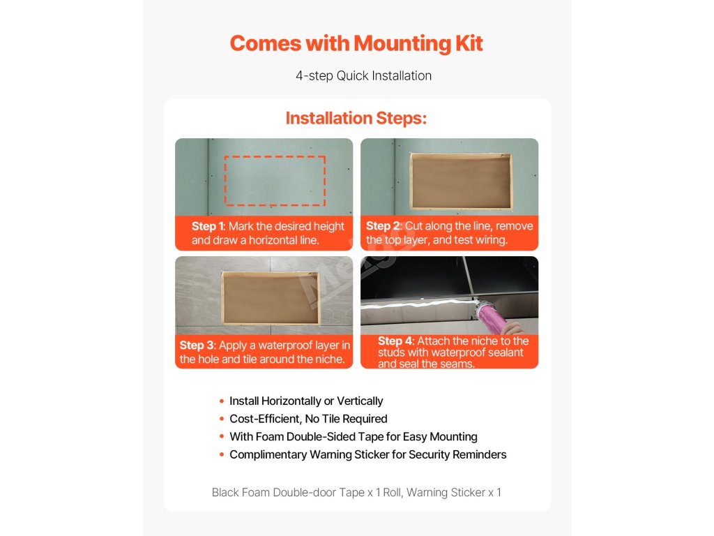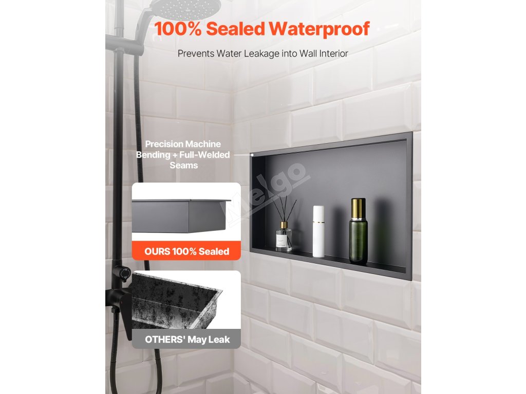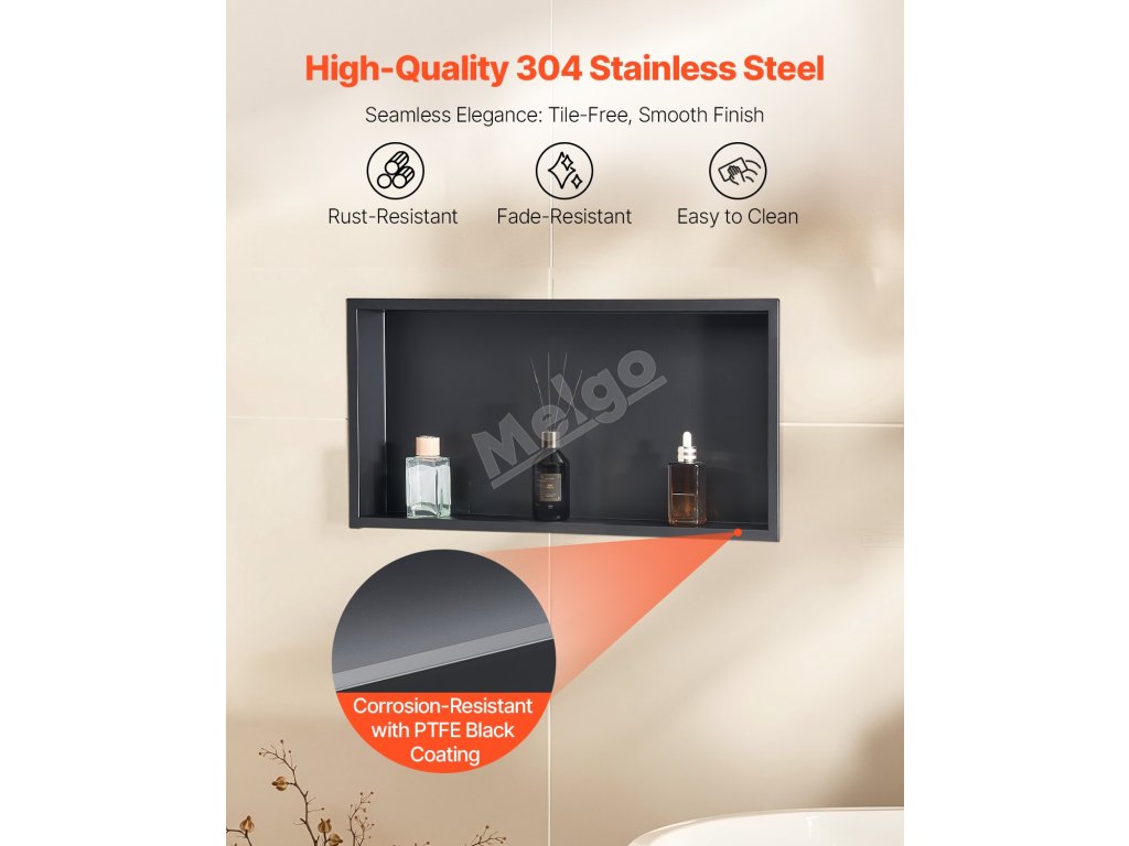 Sprchová nika VEVOR je vyrobena z nerezové oceli 304, je 100% utěsněná a vodotěsná, má povrchovou úpravu odolnou proti korozi, snadno se čistí a je odolná proti poškrábání. Je vybaven předinstalovanou dutou policí, která zabraňuje hromadění vody, ideální do koupelen, šaten a kuchyní.