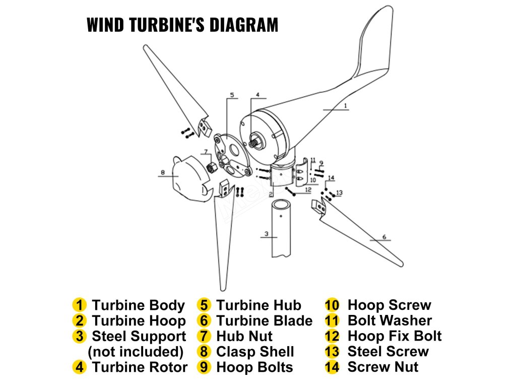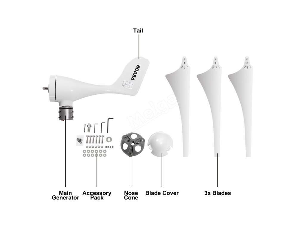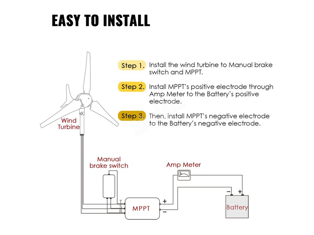 Generátor větrné turbíny využívá jednoduchý způsob instalace "udělej si sám" a veškerý materiál je součástí dodávky. Lze jej použít ve spojení se solárními panely.