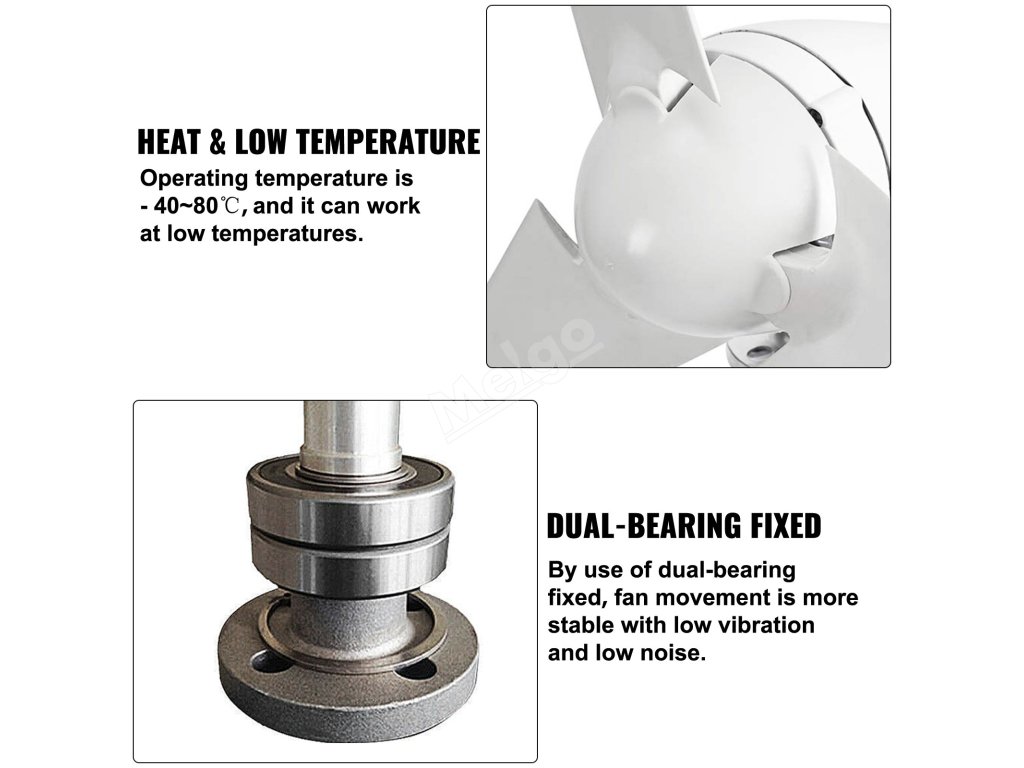 Větrná turbína je navržena s měděnou cívkou, vysoce kvalitní hliníkovou slitinou a díly z nerezové oceli, takže má dobrou antioxidační a antikorozní schopnost v jakýchkoli nepříznivých podmínkách.