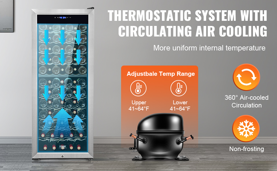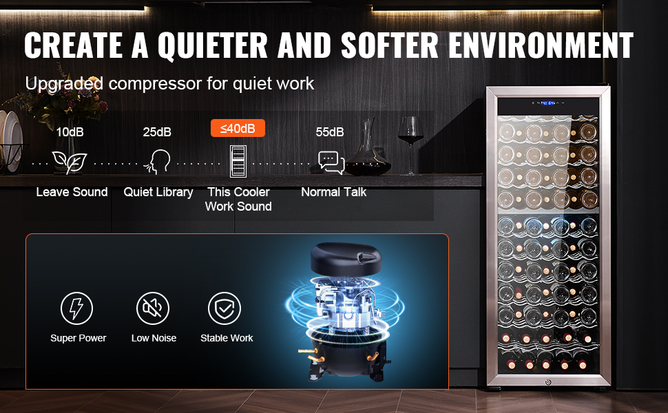 Táto voľne stojaca chladnička na víno je vybavená vylepšeným kompresorom a poskytuje rýchle, výkonné a stabilné chladenie bez potreby cirkulačného spínača, čím zabezpečuje, že vaše víno nebude nikdy príliš vychladené.