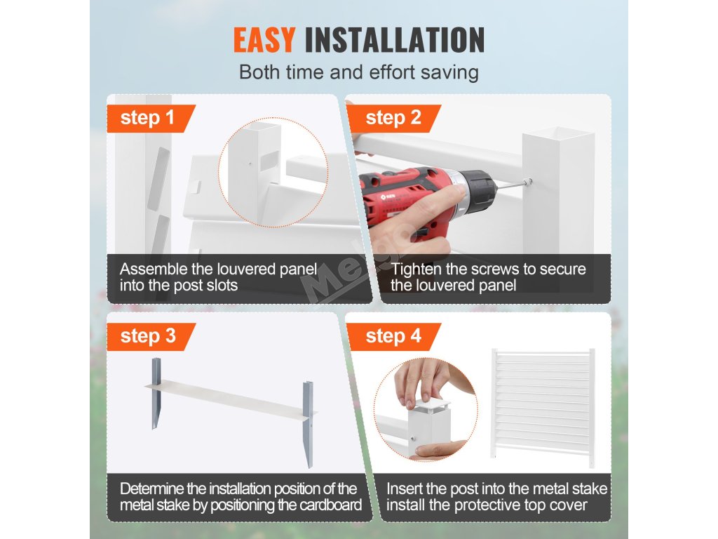Přiložené vinylové plotové panely jsou dodávány s příslušenstvím a podrobnými pokyny, takže je lze rychle nainstalovat podle podrobných pokynů. Kovové kolíky nahrazují plastové kolíky, čímž se zvyšuje celková robustnost. Ochranné krytky ve tvaru deštníku mohou snížit hromadění vody.