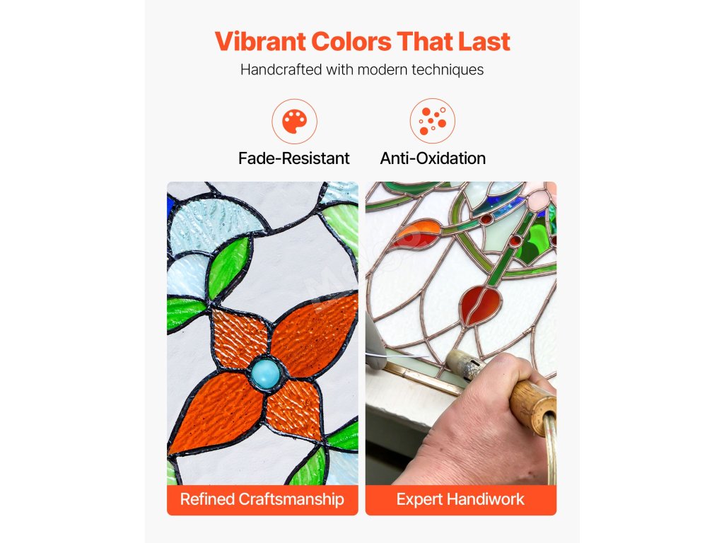 Vitrážový panel je zarámován v pevném kovovém rámu a je odolný proti deformacím a poškození. Vysoce průhledné sklo propouští sluneční světlo a vrhá barevné odlesky, které naplní váš pokoj snovou září a stylovým dojmem.
