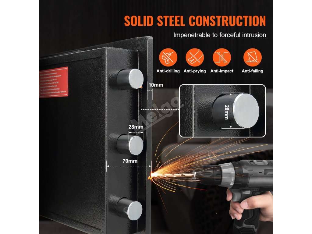 Tento trezor je vyroben z jednoho kusu robustní 10 mm silné oceli a je spolehlivý a bezpečný. Díky třem silným 28mm šroubům účinně brání krádeži, vloupání do domu a neoprávněnému přístupu a poskytuje tak vynikající ochranu vaší domácnosti nebo firmy.