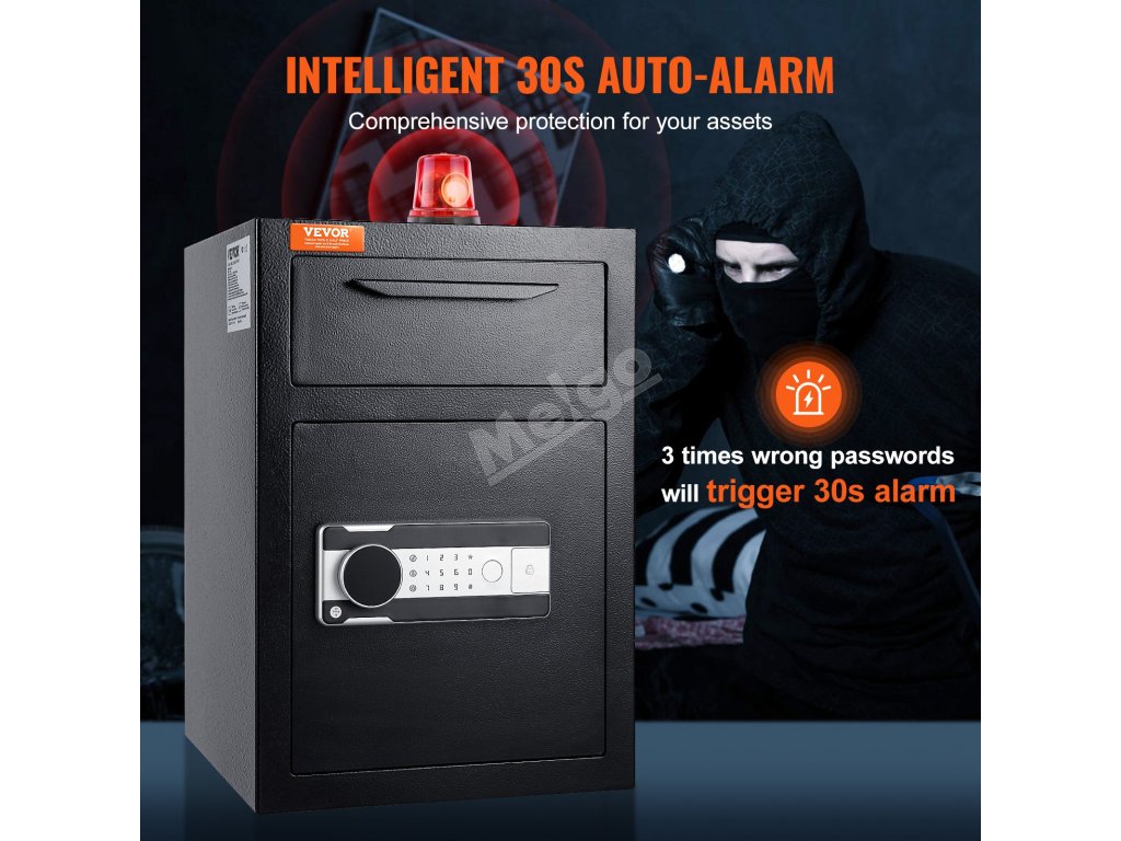 Náš trezor s vhazovacím otvorem je vybaven inteligentní 30sekundovou funkcí automatického alarmu. Pokud se neoprávněný uživatel pokusí prolomit vaše heslo, zadáním tří po sobě jdoucích nesprávných hesel se spustí automatický 30sekundový alarm. Tato rychlá reakce vám umožní okamžitě jednat.