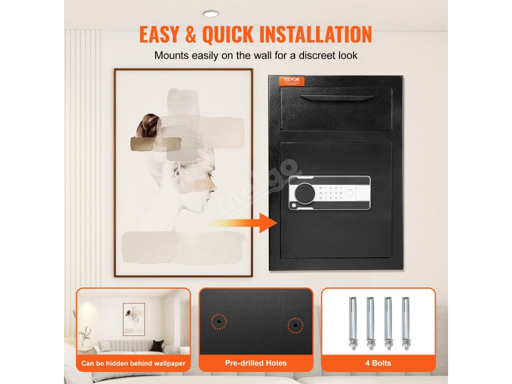 Užijte si bezproblémovou instalaci! Dva předvrtané instalační otvory na trezoru se zasouvací štěrbinou dokonale lícují s dveřmi, což zjednodušuje proces instalace, kterou lze provést během několika minut.