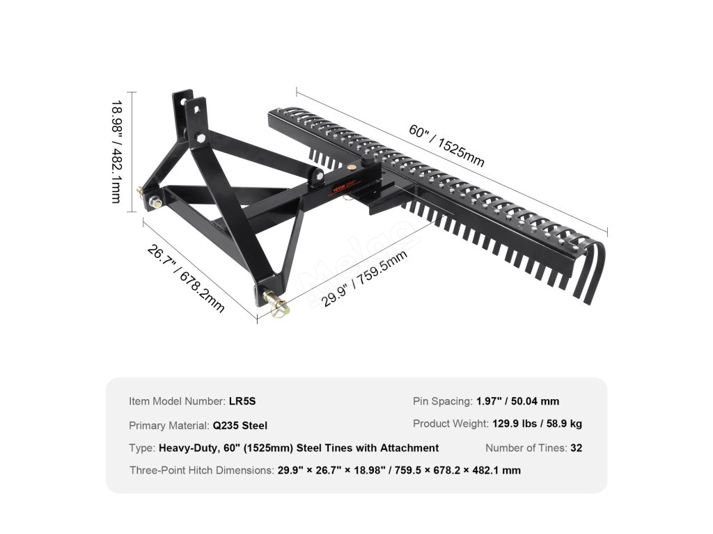 Vlečný vertikutátor trávníku 60"/152.4 cm 3-bodový s přílohami