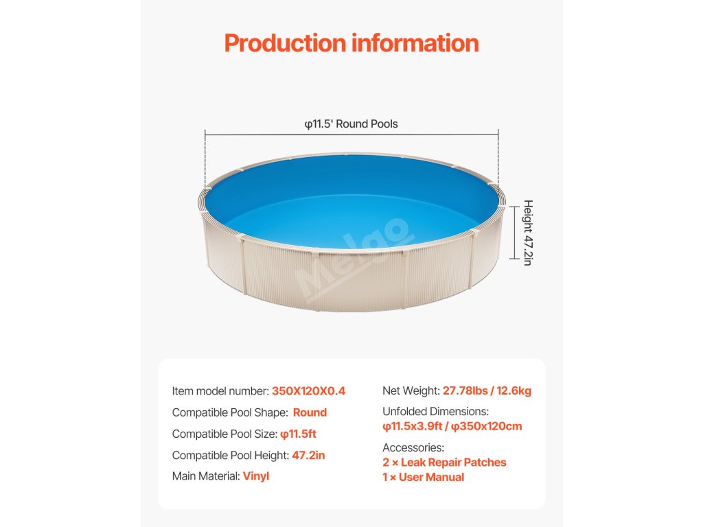 Tato bazénová vložka je vyrobena z odolného vinylu a je určena pro kruhové bazény o délce 11,5 stopy a výšce stěny 47 palců. Je vyrobeno tak, aby vydrželo, a nabízí vynikající odolnost proti opotřebení, propíchnutí a roztržení. Vložka je odolná vůči UV záření, chlóru a zajišťuje dlouhou životnost. Ideální pro rychlou instalaci na dvoře nebo zahradě.