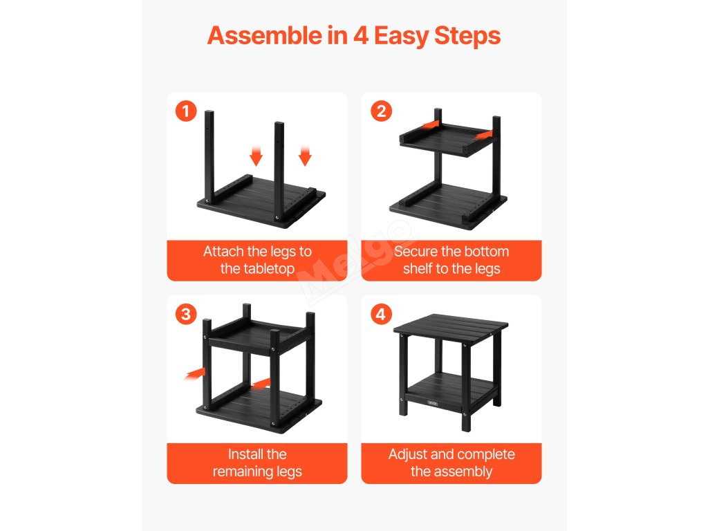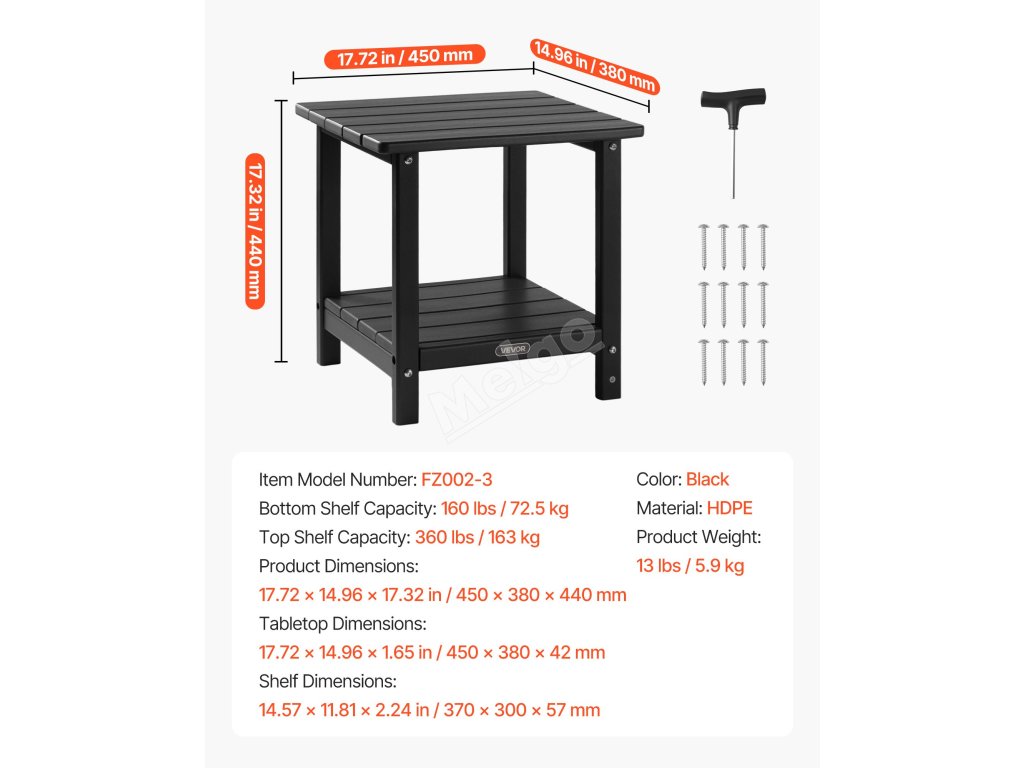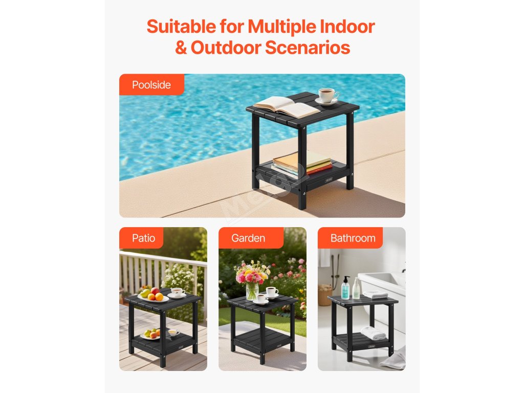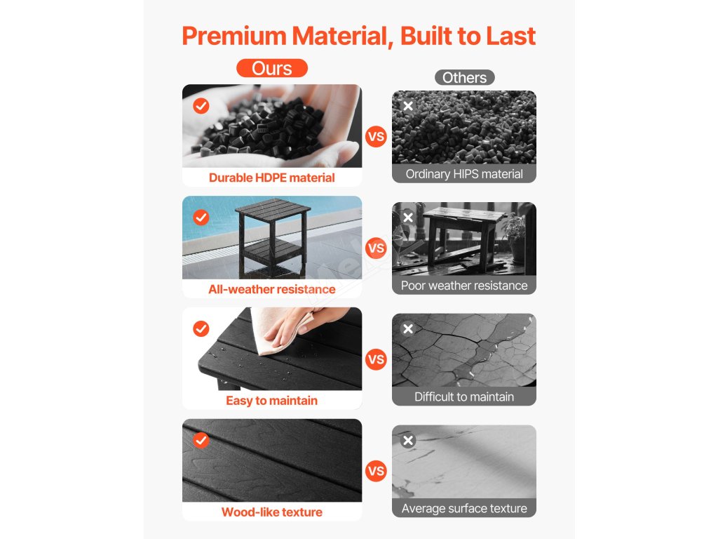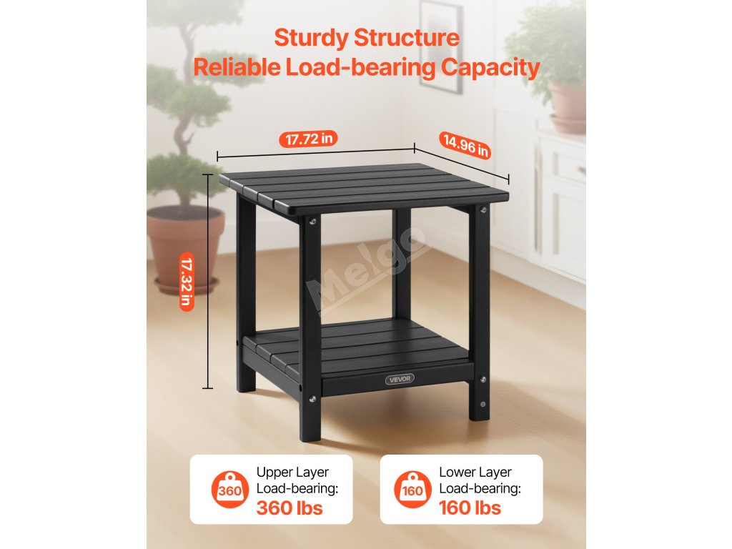 Tento venkovní odkládací stolek je vyroben z vysoce kvalitního materiálu HDPE a má pevnou konstrukci H-rámu, takže nabízí vynikající pevnost. Horní deska unese až 360 kg a spodní police až 160 kg.