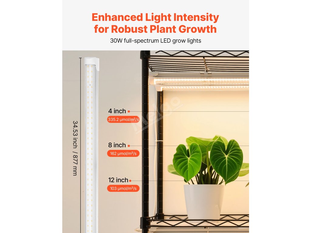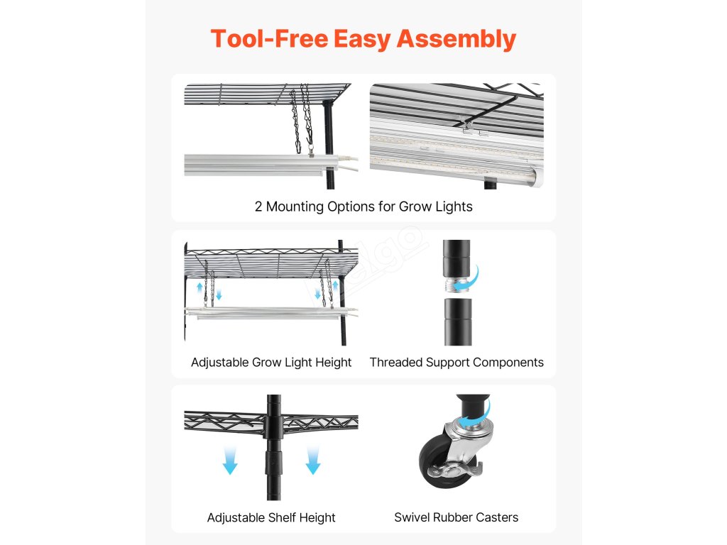 Rostoucí světelná police Obsahuje veškeré příslušenství a srozumitelný návod. Nepotřebujete žádné nářadí ani složité kroky - vše rychle nastavíte a můžete si užívat zahradničení v interiéru bez stresu.