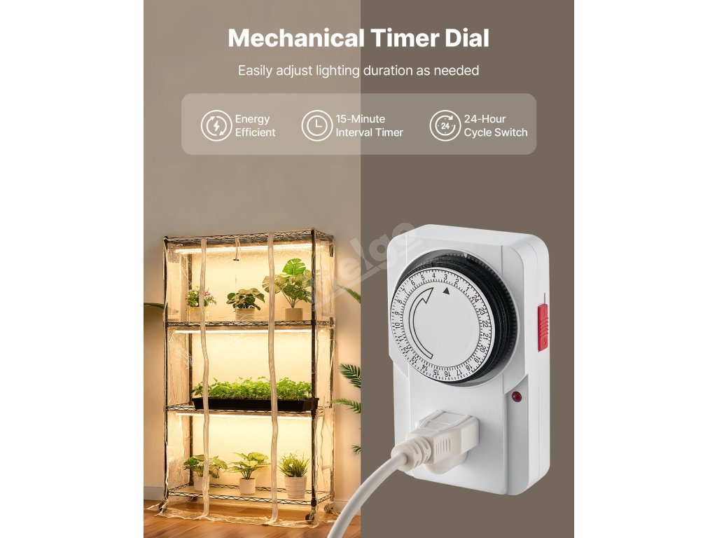 Jednoduchý otočný časovač vyžaduje pouze jedno nastavení pro denní automatické cykly zapnutí/vypnutí. I na cestách budou mít vaše rostliny neustálou péči bez starostí.