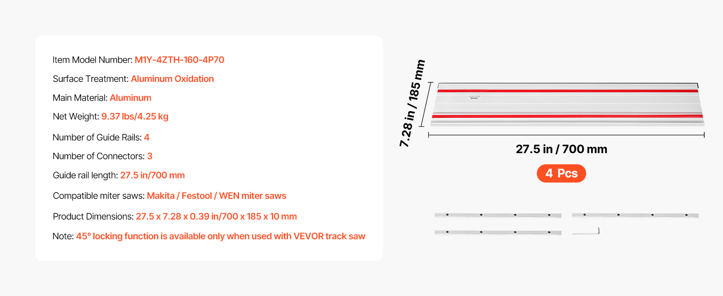 Tato sada obsahuje čtyři 27,5palcové vodicí lišty a tři upevňovací prvky pro rovné, vyvážené a přesné řezy dlouhých nebo složitých obrobků. Vyrobeno z hliníku odolného proti korozi s lištami s nízkým třením pro hladký chod. Kompatibilní s řetězovými pilami Makita, Festool a WEN pro snadnou modernizaci nářadí.
