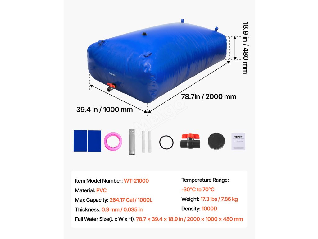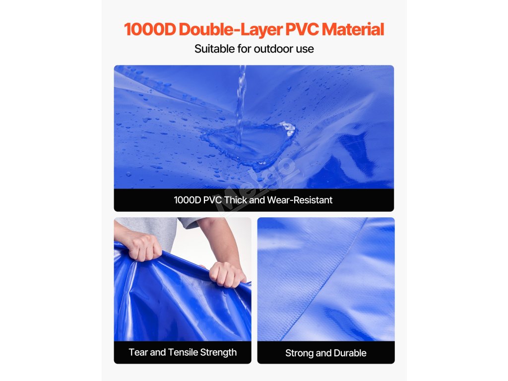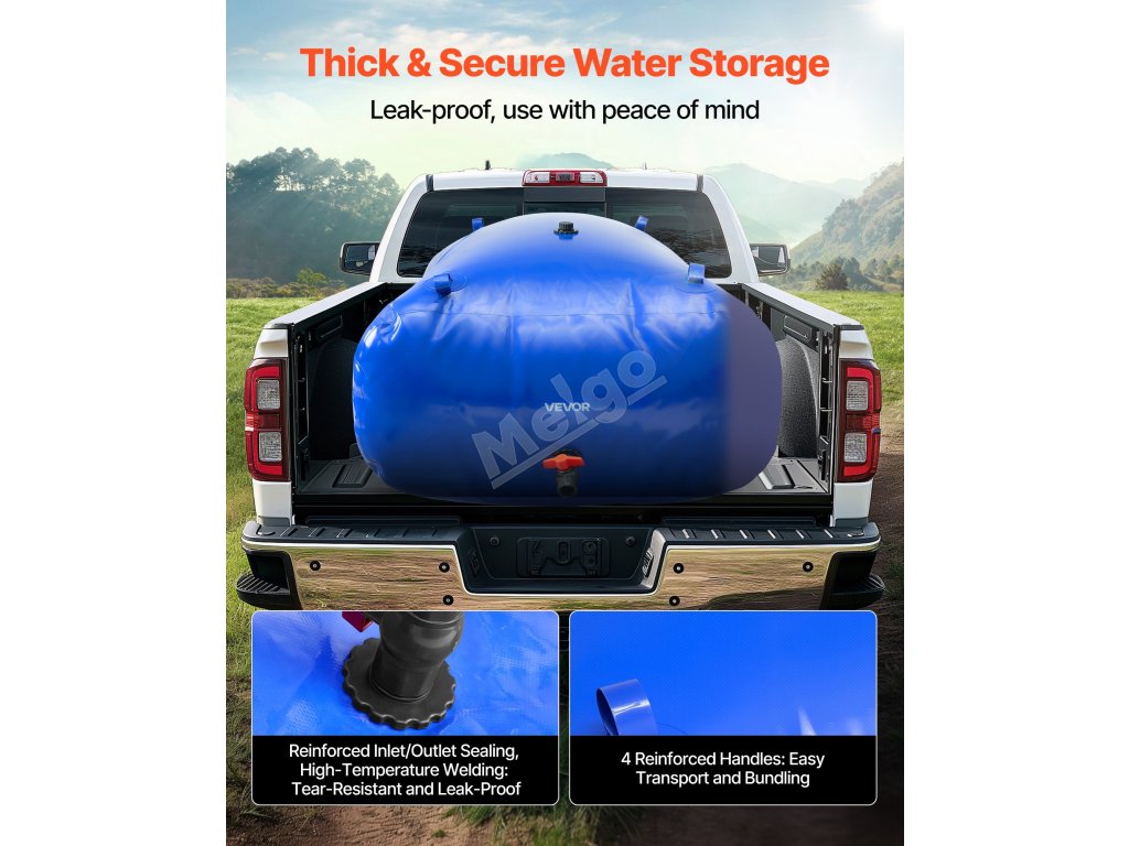 Tento skládací vak na vodu VEVOR o objemu 264 galonů/1000 l je vyroben z odolného dvouvrstvého PVC materiálu 1000D, který zajišťuje vynikající odolnost. Jeho pevné těsnění a nepropustná konstrukce zajišťují spolehlivé skladování vody pro venkovní dobrodružství, domácí použití, zahradničení nebo nouzové situace.
