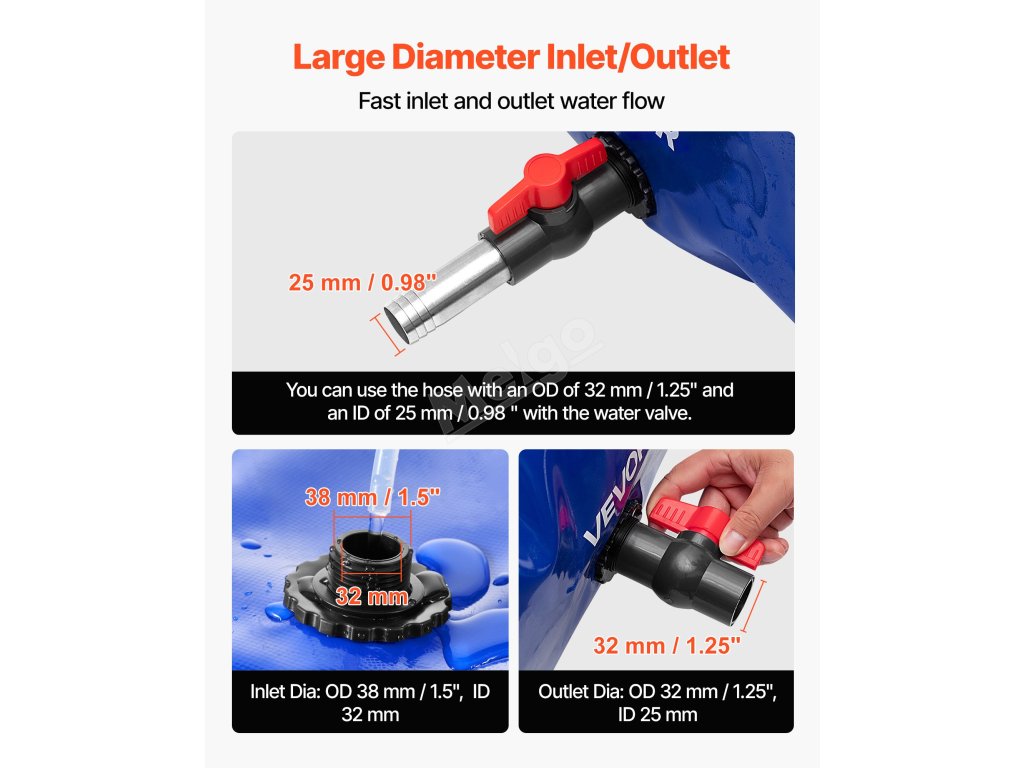 Naše skládací nádoba na vodu je vybavena vstupy a výstupy o velkém průměru, které zajišťují plynulý průtok vody a snadnou kompatibilitu s různými hadicemi a tlakovými myčkami. Ideální pro domácí použití, kempování a další outdoorové aktivity.