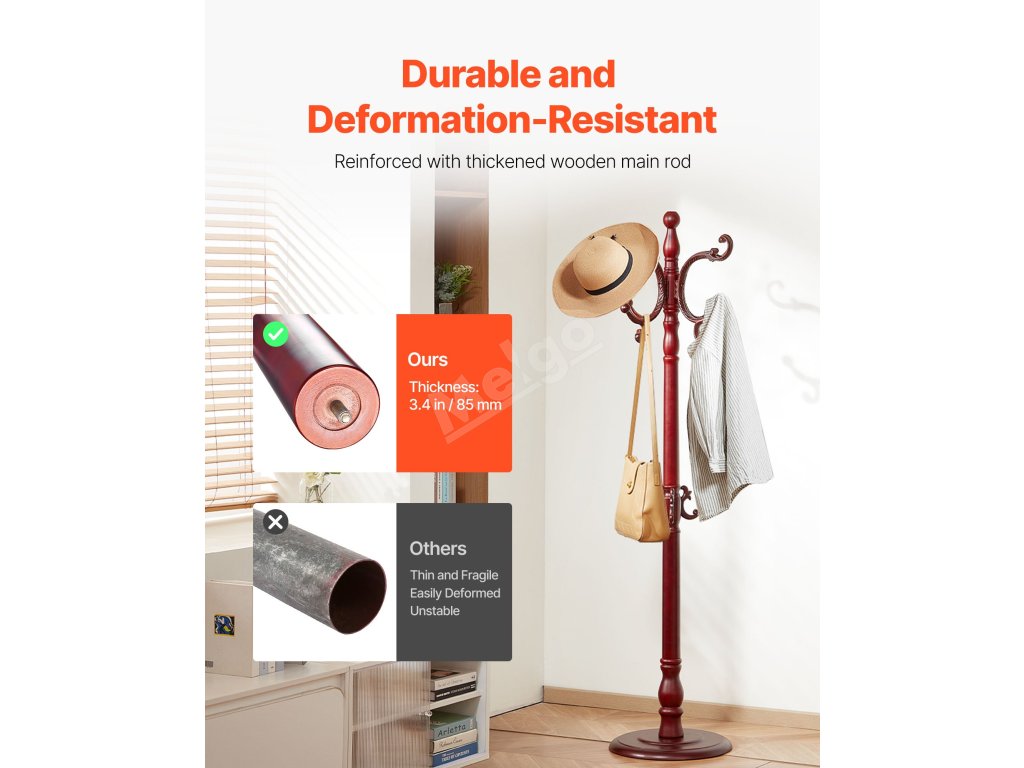 Proč je náš volně stojící věšák na oblečení tak stabilní a odolný? Je vybaven vyztuženou hlavní dřevěnou tyčí, zatíženou dřevěnou základnou proti překlopení a protiskluzovými spodními podložkami - bezpečně udrží kabáty, tašky i klobouky a stane se nepostradatelným doplňkem vaší domácnosti.