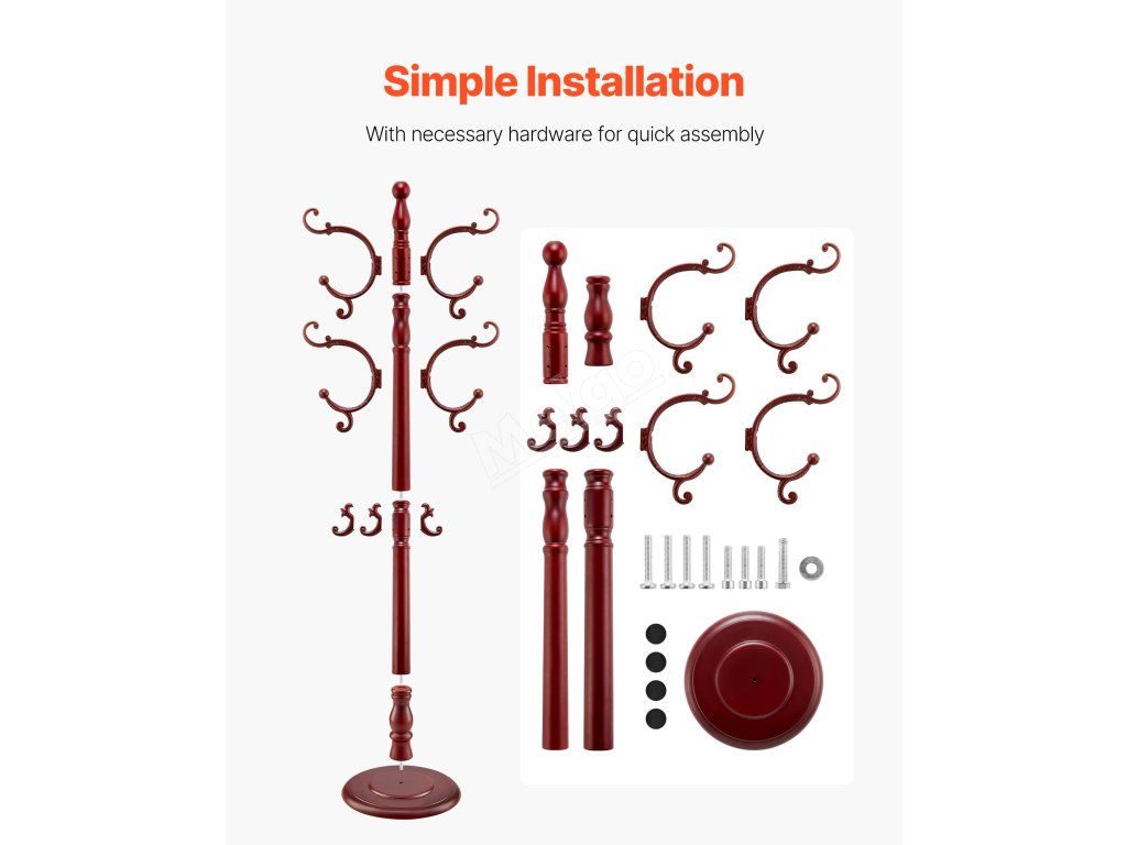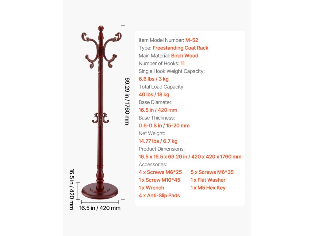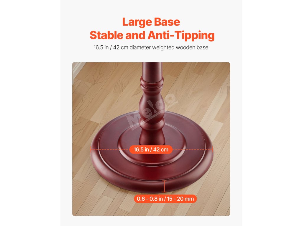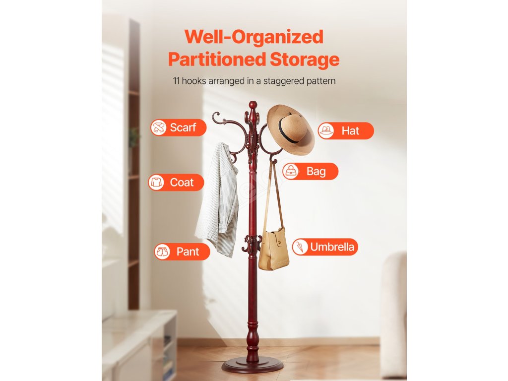 S věšákem VEVOR budou kabáty, klobouky, šály a kabelky přehledně zavěšené a uspořádané. Tento stylový věšák na oblečení má zatíženou dřevěnou základnu, 11 šachovnicových háčků a vyztuženou hlavní dřevěnou tyč - ideální do vstupních prostor, ložnic, kanceláří nebo obývacích pokojů.