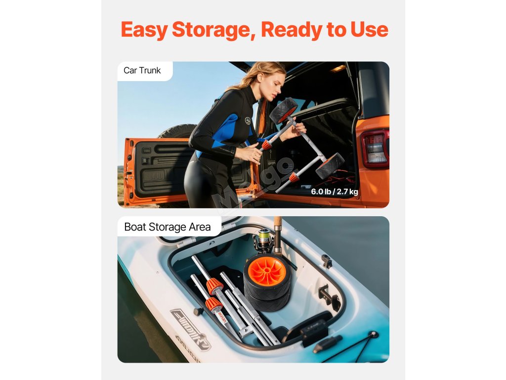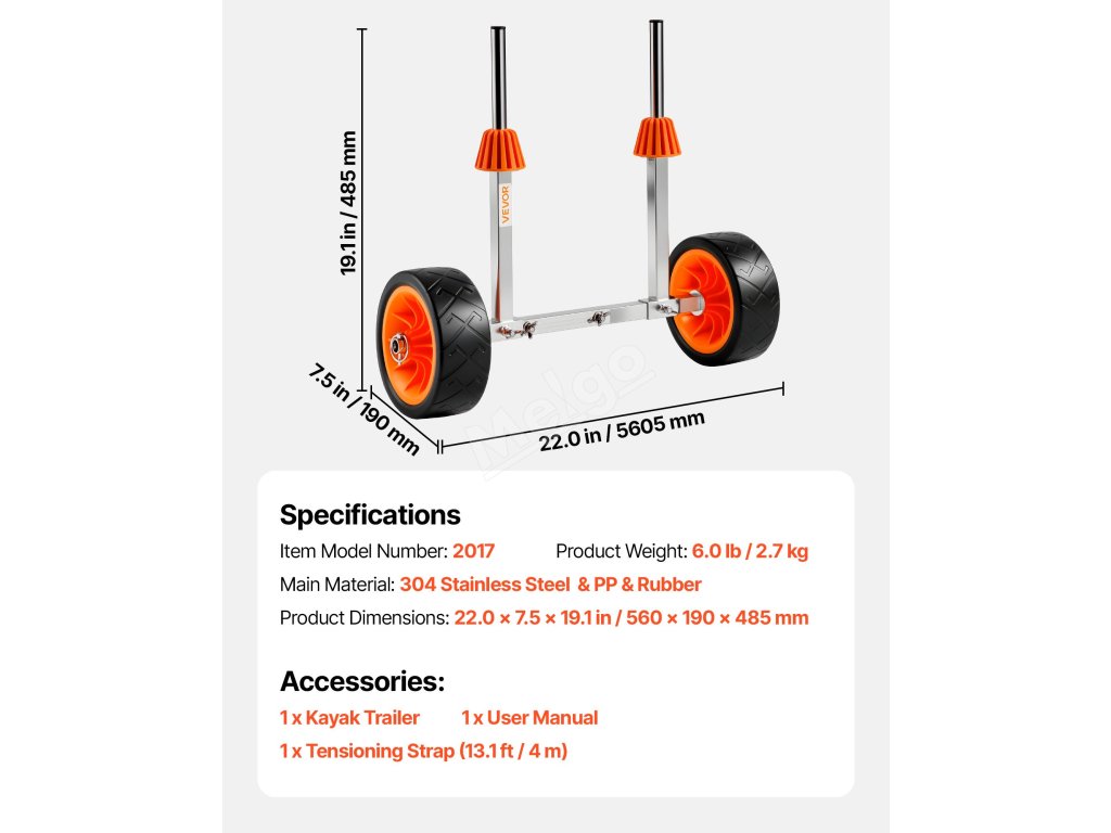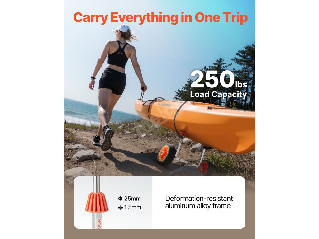 Tento kajakový vozík s nosností 250 kg je vhodný pro přepravu malých lodí nebo kajaků s vybavením. Je snadno přenosný, bezpečný a ideální pro příležitostné výlety do přírody a lehkou přepravu.