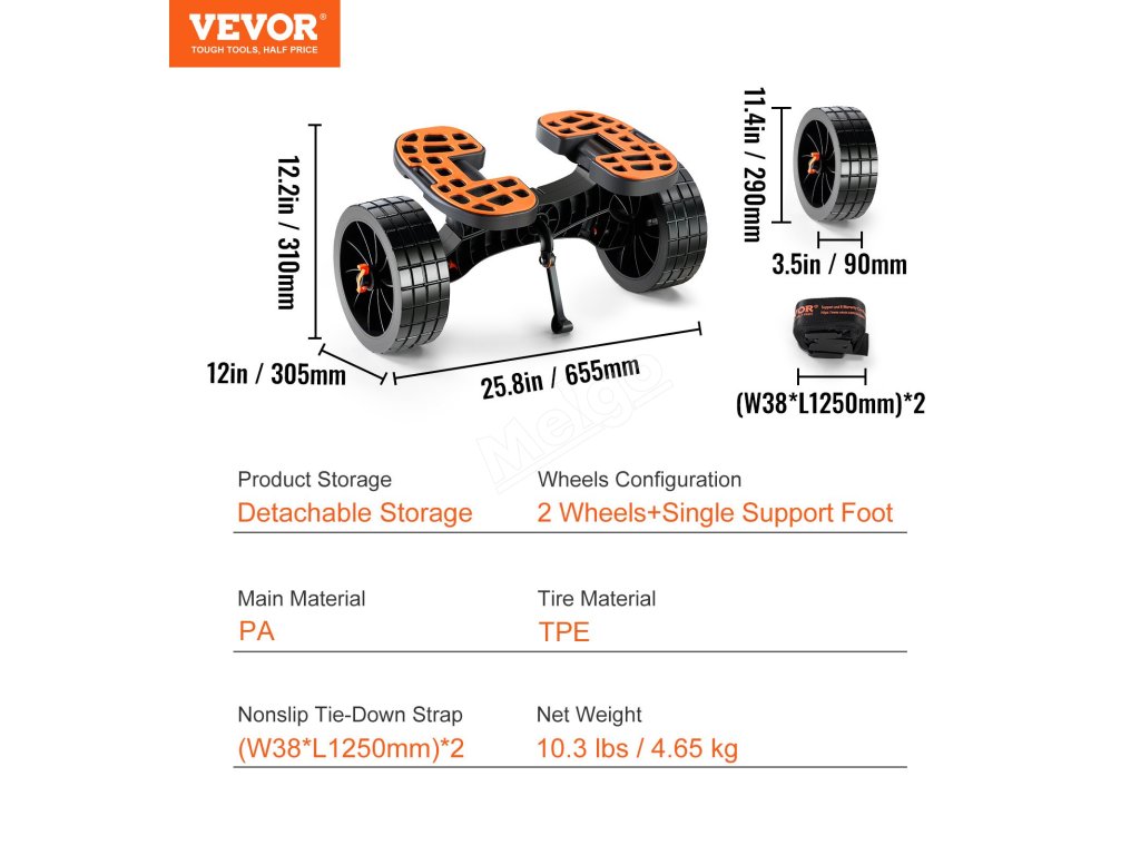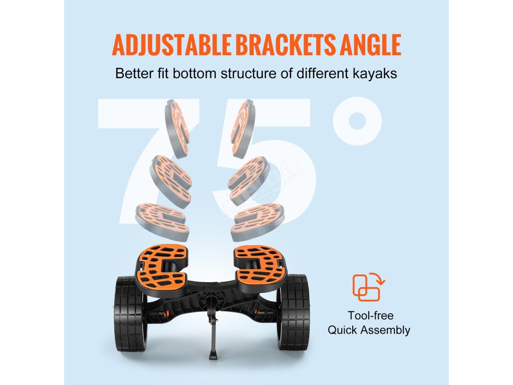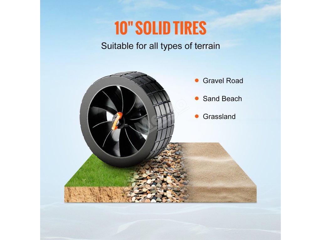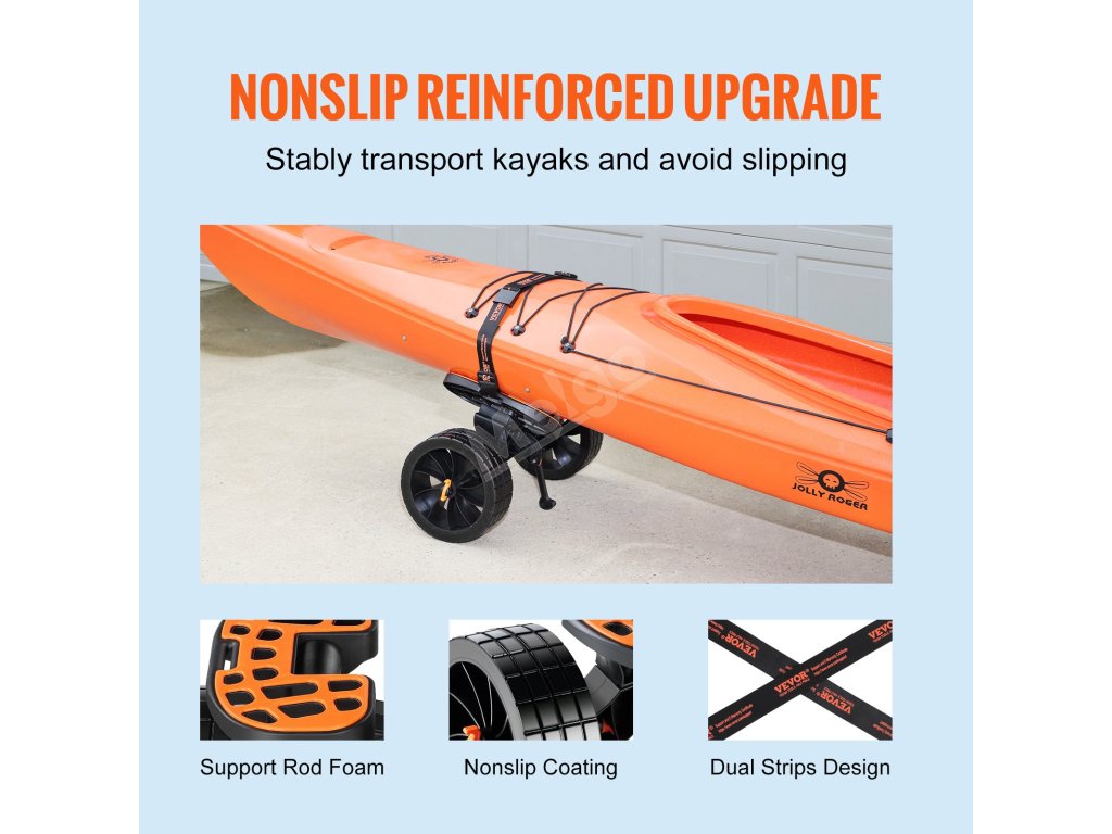 Kajakársky vozík VEVOR je vybavený veľkými 10'' plnými pneumatikami. Tieto pneumatiky uľahčujú pohyb kajakov po rôznych terénoch. Či už ide o piesok, štrk alebo betón, pneumatiky zvládnu všetko. Pevný PU materiál zaručuje, že sa pneumatika nerozbije. To znamená menej starostí a viac pohodlia. Veľký rozmer pneumatík navyše pomáha pri tlmení nárazov. Znižuje tak zaťaženie kajaku a uľahčuje tlačenie alebo ťahanie. Poskytujú skvelú trakciu, takže váš kajak zostane bezpečný a stabilný. Môžete sa spoľahnúť na kajakársky vozík VEVOR, vďaka ktorému bude preprava vašej lode jednoduchá.