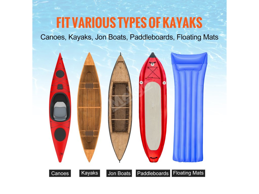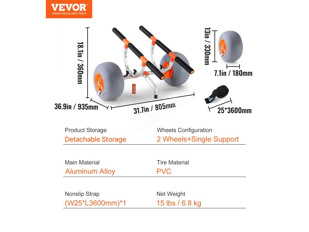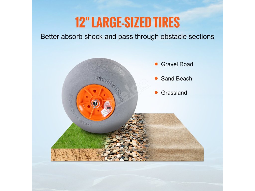 Ťažký vozík na kajak VEVOR má nosnosť až 350 libier. Vďaka tomu je vhodný pre rôzne modely kajakov a zaťaženia. Je ideálny pre rôzne typy kajakov vrátane pevného rámu z hliníkovej zliatiny. Náš rám z ťažkej hliníkovej zliatiny zaručuje odolnosť a pevnosť. Veľké 12-palcové pneumatiky z PVC sú navrhnuté tak, aby si ľahko poradili s rôznymi terénmi. Tento vozík si ľahko poradí s hmotnosťou a zabezpečí plynulý pohyb, či už na kamenistej pláži, alebo na piesočnatom pobreží. Svoj kajak môžete bez problémov prepravovať aj v náročných podmienkach.