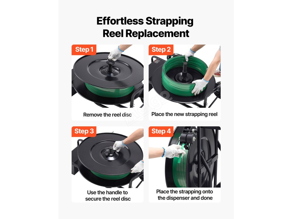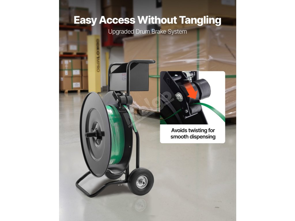 Tento páskovací vozík je vhodný pro PET/PP/ocelové páskovací kotouče s 16palcovými / 8palcovými jádry a je vybaven bubnovou brzdou pro snadné a efektivní použití pásky.