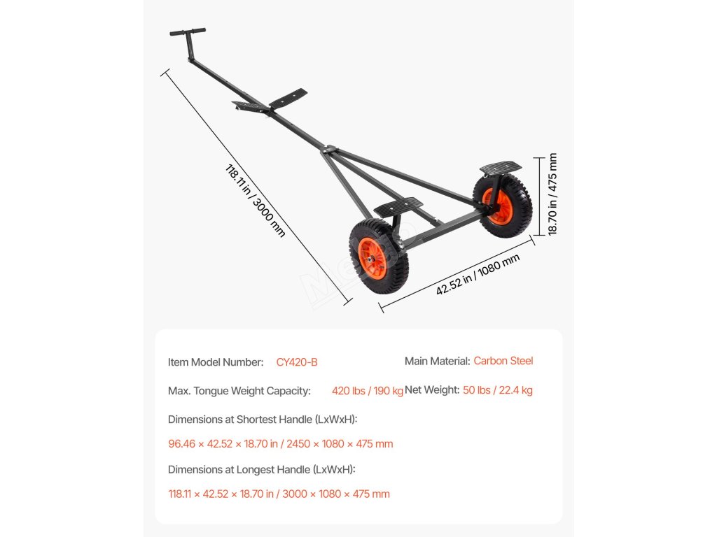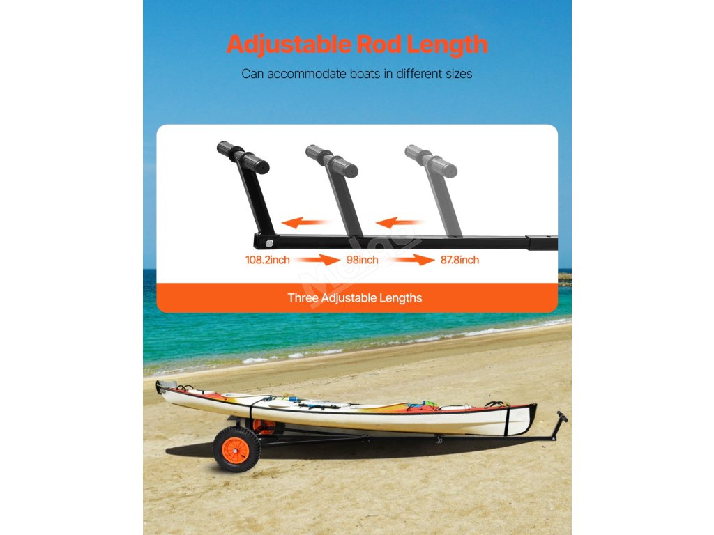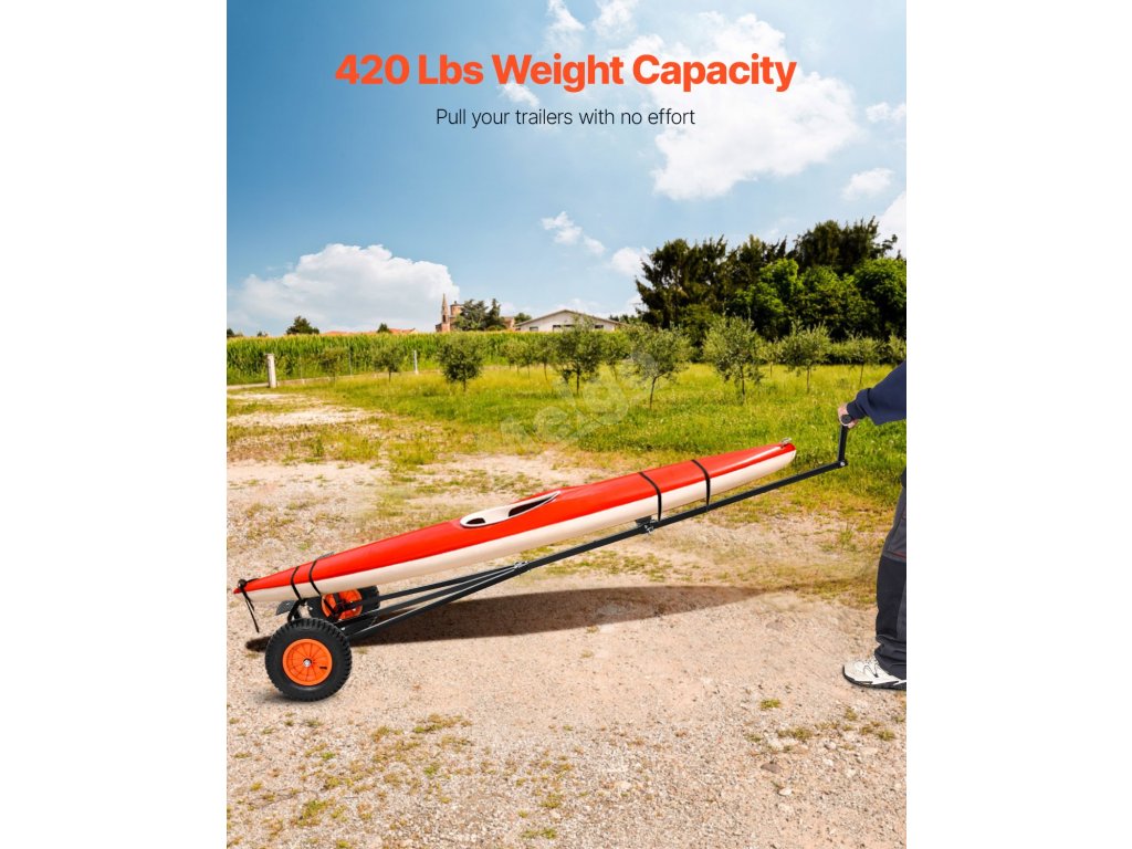 Tento přívěs má velkou nosnost 420 lb, což usnadňuje přesun těžkých lodí na krátkou vzdálenost. Tyč je délkově nastavitelná, aby se vešla na různé typy lodí.
