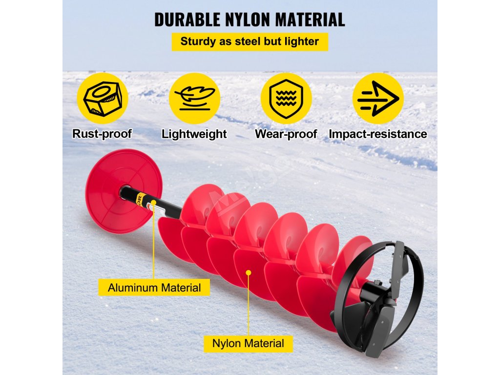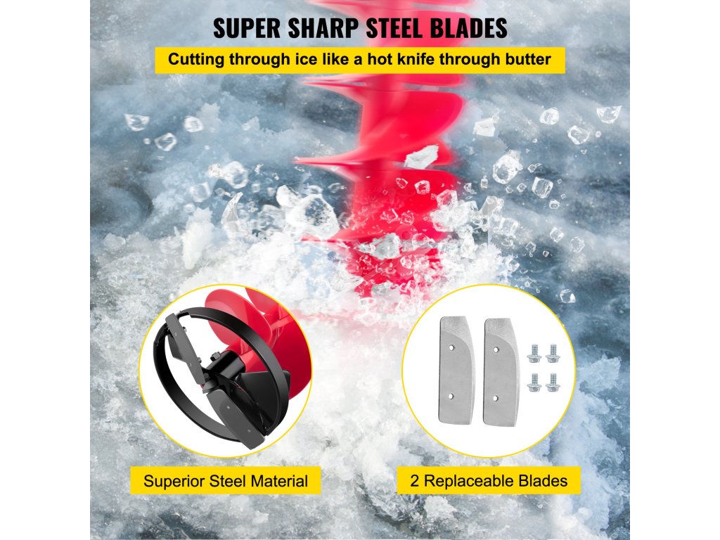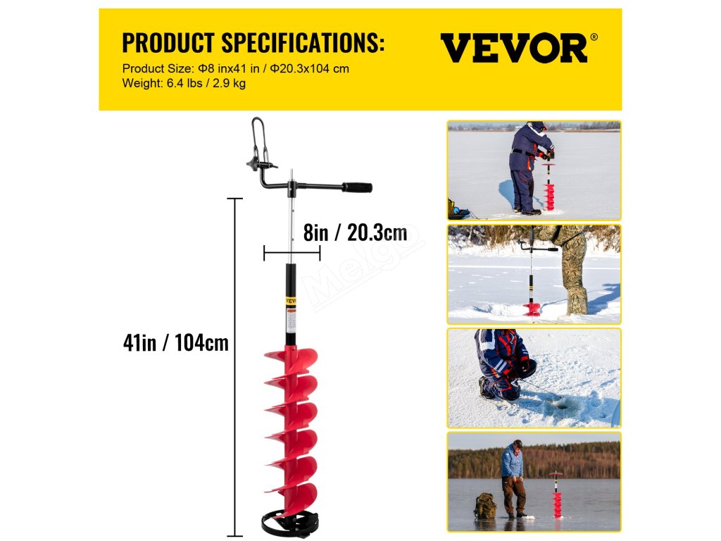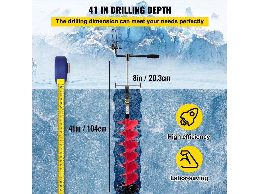 Maximální hloubka vrtání šneku na led: 41"; průměr otáčení nože: 8". Vrták je lehký, ostrý a odolný a lze jej použít pro rybolov v ledu, vědecký průzkum atd.