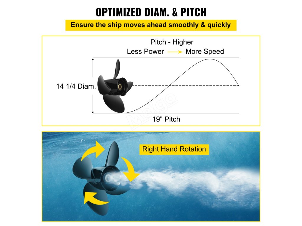 Naše vrtule má průměr 14 1/4" a stoupání 19". Vrtule s větším průměrem poskytnou vaší lodi větší kontrolu a výkon a větší stoupání zvýší maximální rychlost vaší lodi.