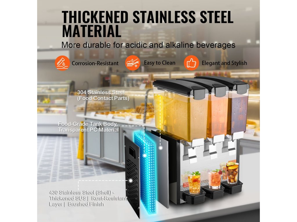 Šetří čas a energii díky stabilnímu výkonu kompresoru a výkonnému provozu. Výparník rychle mrazí a během chlazení udržuje teplotu šťávy v rozmezí 45-54 °F (7~12 ℃). Je vybaven nezávislými spínači pro samostatné ovládání míchání a chlazení.