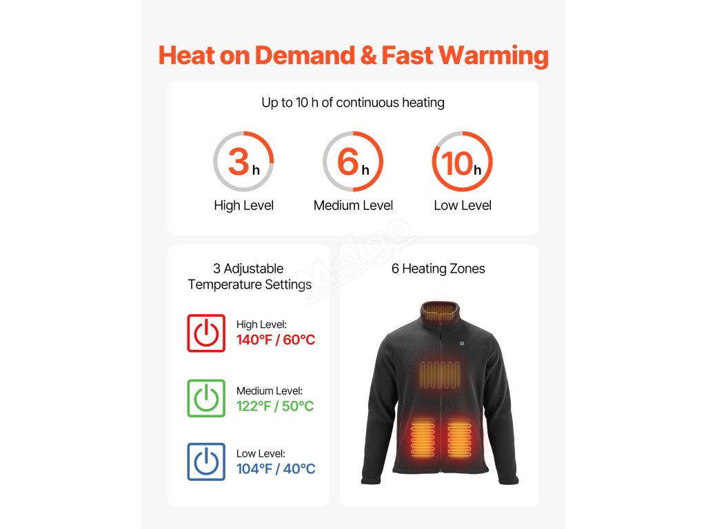 Naše vyhřívaná fleecová bunda poskytuje spolehlivý výkon, který vás udrží ve stálé teplotě a teple kdykoli a kdekoli. Je ideální pro práci venku v krutých mrazech, sport, kempování, jízdu na kole, dojíždění do práce i do klimatizovaných místností, také pro sdílení s rodinou nebo přáteli.