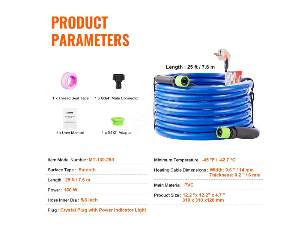 Během zimních nocí ve většině regionů běžné hadice kvůli nízkým teplotám zamrzají. S vyhřívanou hadicí na vodu VEVOR pro obytné vozy si můžete při kempování v obytném voze užívat běžného používání vody i při teplotách až -45 °C.