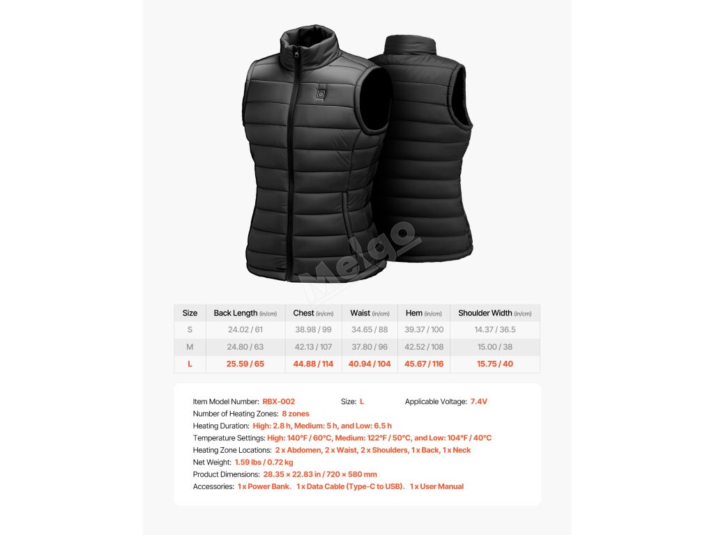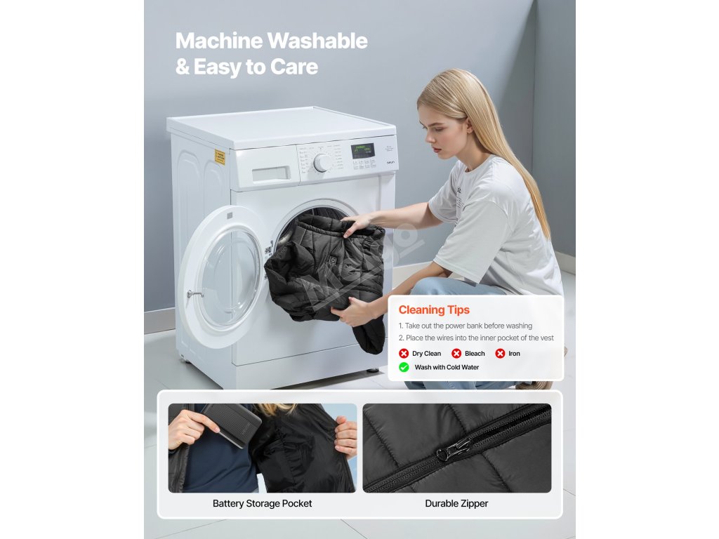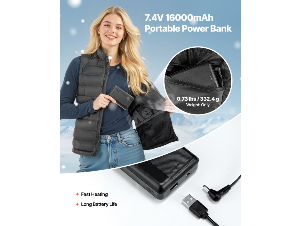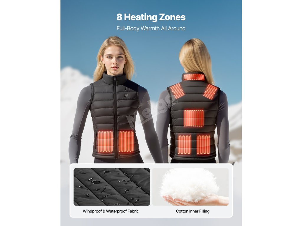 Tato vyhřívaná vesta má 8 vyhřívacích zón a 3 úrovně regulace teploty. Její měkká tkanina zajišťuje pohodlné nošení a provedení, které lze prát v pračce, se snadno čistí a udrží vás v teple i v zimě.