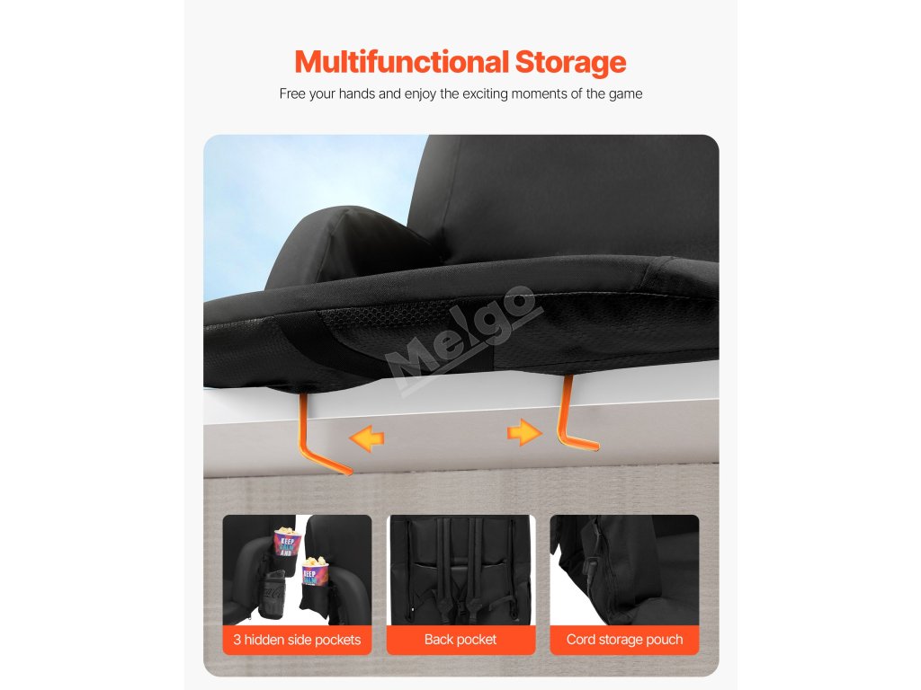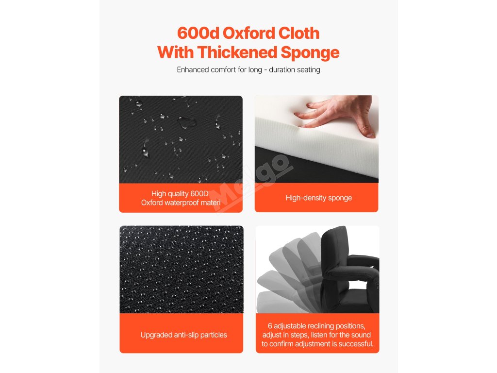 Toto polohovací křeslo je vyrobeno z robustních rámů, houby s vysokou hustotou a voděodolné tkaniny 600D Oxford, která je odolná a pohodlná. Povrch odolný proti povětrnostním vlivům se navíc snadno čistí a udržuje. Je vybavena několika kapsami, které jsou ideální pro uložení lahví s vodou, svačiny a kapesníků.