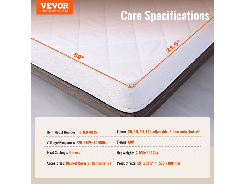 Vyhřívaný matrační potah 150×80 cm, 4 stupně, 12h časovač, 8h vyp.