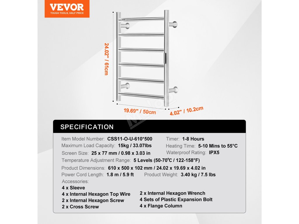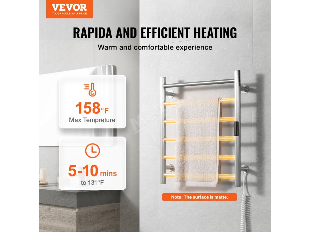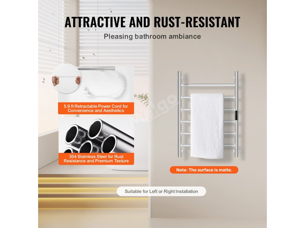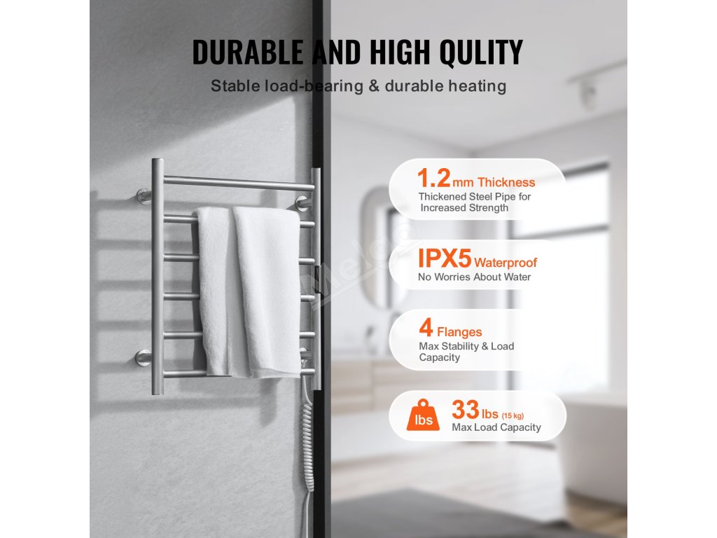 Ohřívač ručníků je vyroben z nerezové oceli, má robustní rám a vodotěsnost IPX5, což zaručuje vynikající výkon.