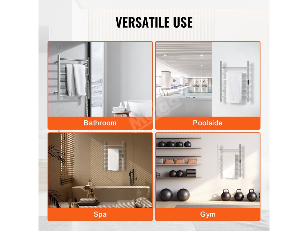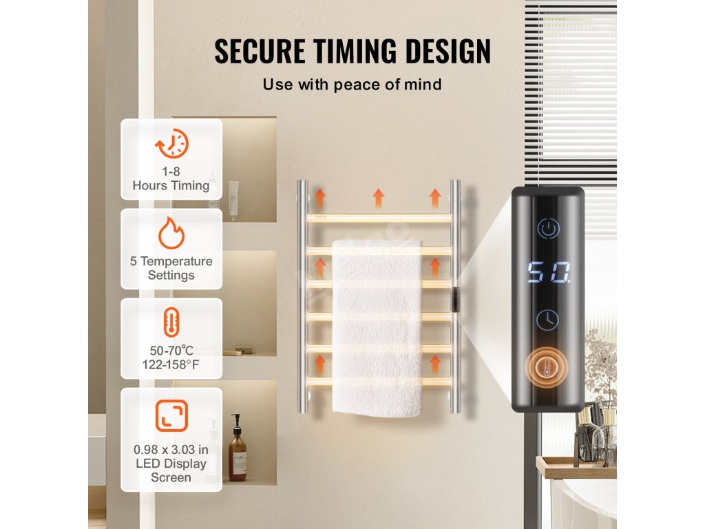 Elektrický ohřívač ručníků je vybaven digitálním časovačem a umožňuje nastavit automatické zapnutí a vypnutí, takže je vhodný, když nejste v místnosti.